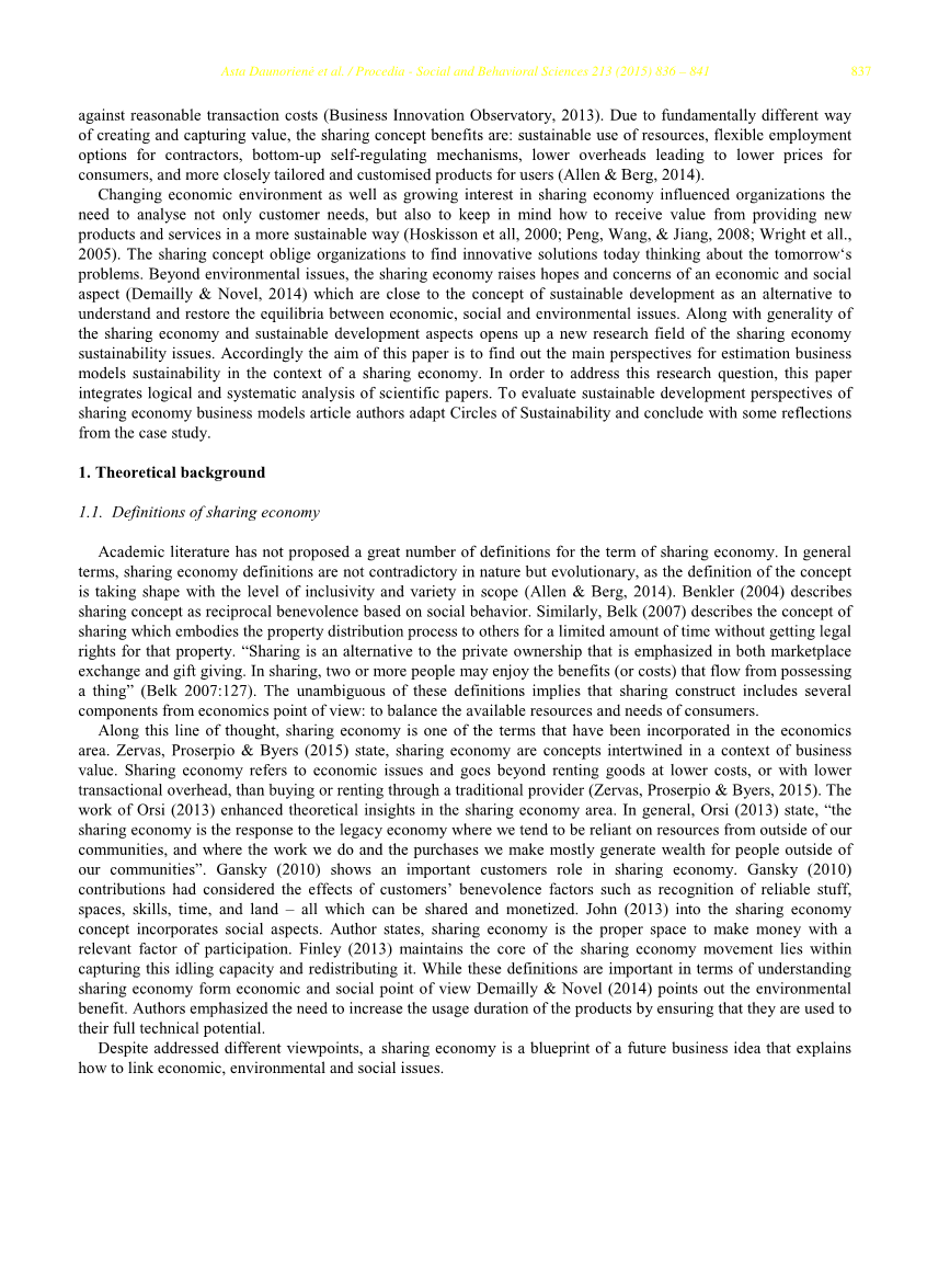 学术界对共享经济的定义还没有提出很多。总的来说,共享经济的定义在性质上并不矛盾,而是演变而来的,因为这一概念的定义是随着包容性和范围的多样性而形成的(Allenamp;Berg,2014)。Benkler(2004)将共享概念描述为基于社会行为的互惠善意。同样,Belk(2007)描述了共享的概念,它体现了在有限的时间内向他人分配财产的过程,而没有获得对该财产的合法权利。“共享是私人所有权的一种替代方式,在市场交换和礼品赠送中都强调这一点。在共享中,两个或更多的人可以享受拥有一件东西带来的好处(或成本)(Belk2007)。这些定义的明确性意味着,从经济学的角度来看,共享结构包括几个组成部分:平衡可用资源和消费者的需求。按照这一思路,共享经济是经济学领域中的术语之一。Zervas,Proserpioamp;Byers(2015)指出,共享经济是在商业价值背景下交织在一起的概念。与通过传统提供商购买或租赁相比,共享经济指的是经济问题,不仅仅是以更低的成本或更低的交易开销租赁货物(Zervas,Proserpioamp;Byers,2015)。Orsi(2013)的工作增强了共享经济领域的理论洞察力。总体而言,Orsi(2013)指出,“共享经济是对传统经济的回应,在传统经济中,我们往往依赖社区外的资源,我们所做的工作和所做的采购大多为社区外的人创造财富”。Gansky(2010)展示了客户在共享经济中的重要作用。Gansky(2010)考虑了顾客对可靠物品、空间、技能、时间和土地的认可等慈善因素的影响,所有这些因素都可以共享和货币化。John(2013)将社会方面纳入共享经济概念。作者指出,共享经济是一个适当的空间赚钱与相关因素的参与。Finley(2013)认为,共享经济运动的核心在于获取闲置产能并重新分配。虽然这些定义对于从经济和社会的角度理解共享经济很重要,但Demaillyamp;Novel(2014)指出了环境效益。作者强调,必须确保充分发挥产品的技术潜力,从而延长产品的使用期限。