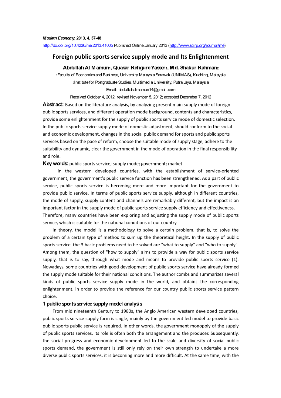 相应的启示,以期为我国公共体育服务模式选择提供借鉴。