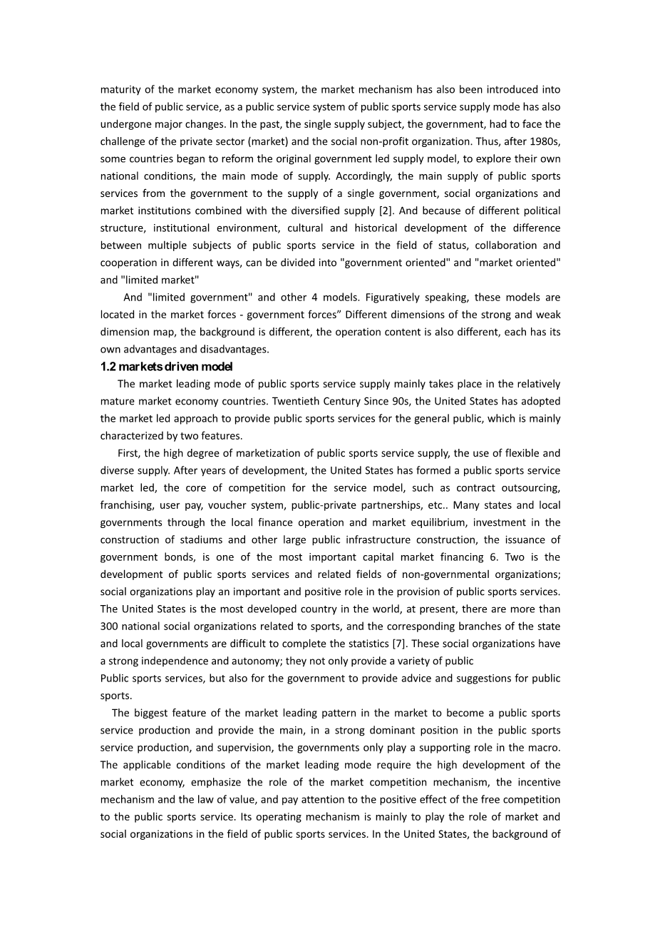 市场主导型公共体育服务供给模式主要发生在市场经济相对较为成熟的国家。20 世纪
