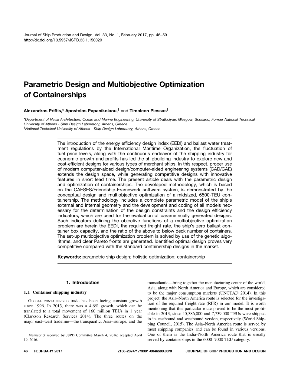 国际海事组织对能效设计指标(EEDI)的引进和压载水的处理规定,以及燃料价格水平的波动,和航运业对经济与利润增长的不断追求,导致造船业为各类商船开辟新的,具有成本效益的设计。在这方面,对现代计算机辅助设计/计算机辅助工程系统(CAD / CAE)的正确使用可以扩展设计空间,同时能在短时间内创造具有创新特征和竞争性的设计。本文介绍了集装箱船的参数化设计和优化。基于CAESES / Friendship-Framework(Abt&Harries 2007)系统开发的方法,通过对中型6500TEU集装箱船的概念设计和多目标优化来论证。该方法包含了完整的船舶几何外部和内部的参数模型,以及确定了设计约束所需模型的全部开发和编码,和用于参数化生成设计评估的设计效率指标。这些定义了一个多目标优化问题的目标函数的指标,在能效设计指标(EEDI)中,这些指标包括所需的运费率,船舶空载时的货舱舱容,以及甲板上和舱内集装箱数量的比例。通过使用遗传算法解决了多目标优化的问题,并生成了清晰的帕累托前线。因此,与市场上的标准集装箱设计相比,确定最佳的设计确实非常具有竞争力。