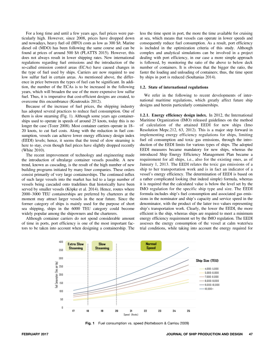 由于燃料价格上涨,航运业采取了多项措施来降低油耗。其中一个是慢驶(图1)。虽然几年前,集装箱船的运行速度约为25海里,但现在已不再是这种情况了(Tozer 2008)。大多数集装箱运营商运营速度为18-20节,以降低燃油成本。随着燃料消耗的减少,船舶能够实现较低的能效设计指标(EEDI)水平; 因此,尽管近期燃油价格略有下降,但这种慢驶的趋势似乎仍然停留在这里(White 2010)。