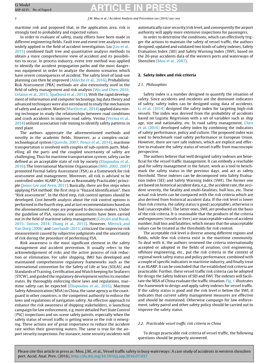 安全指数是旨在量化安全情况的数字。由于事故和事件是安全的主要指标,安全指数可用事故数据计算。Li et al(2014年)设计了针对高风险船舶的安全指数。该指数来自基于逻辑回归的一组变量如船龄、大小和国籍等的事故的概率。在道路交通安全管理中,Chen et al(2016年)结合安全绩效、政策和文化指标开发了安全指数。该指数被欧盟用于道路安全绩效基准。还有从宏观角度明确有效地评估船舶交通安全状态的安全指标。