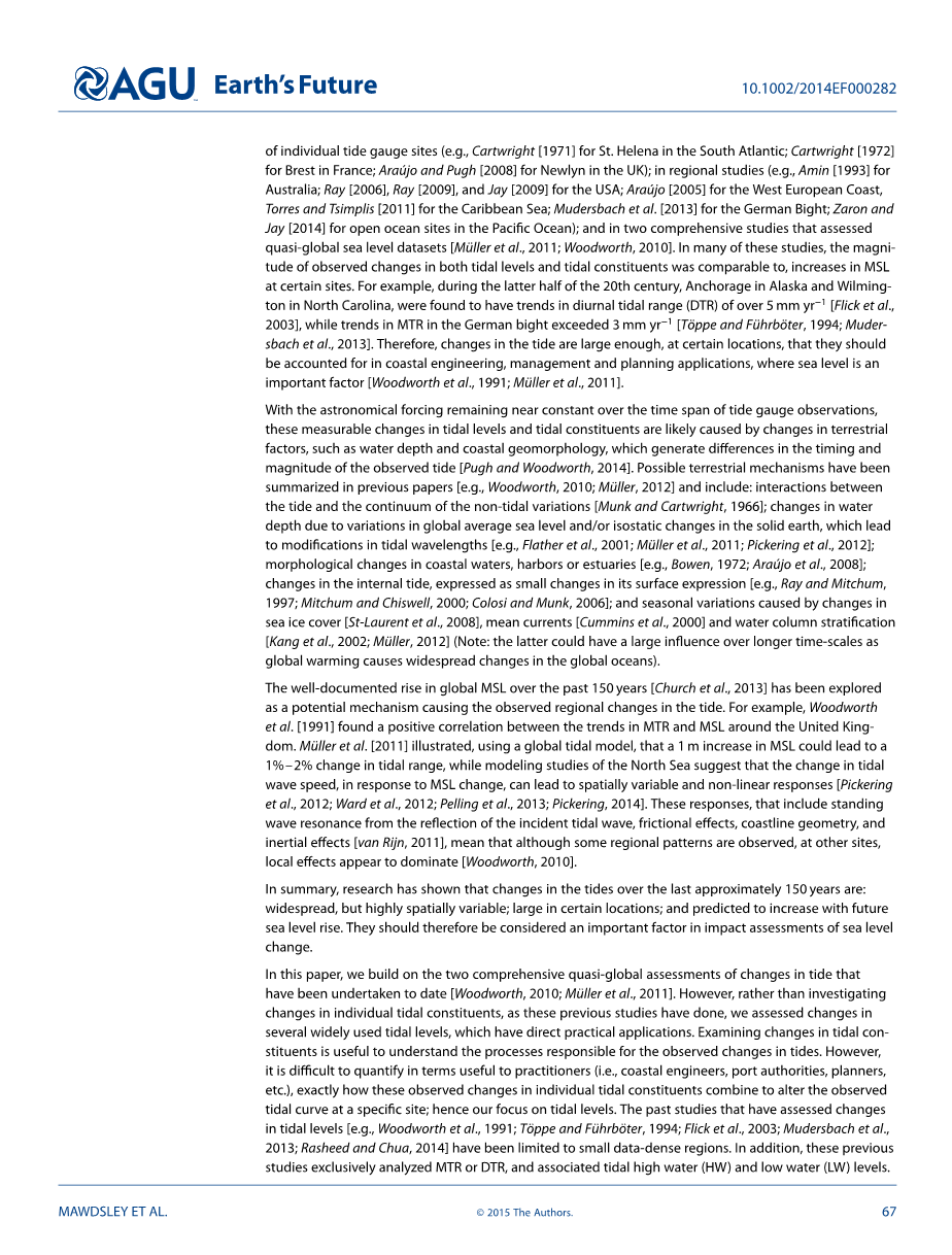 在本文中,我们基于迄今为止进行的对潮汐变化的两个全面的准全球评估[Woodworth,2010; Muuml;ller等,2011]。然而,正如这些先前的研究所做的那样,我们不是调查个别潮汐成分的变化,而是评估几种广泛使用的潮汐水平的变化,这些变化具有直接的实际应用。检查潮汐成分的变化有助于理解引起潮汐变化的过程。然而,对于专业人员(即海岸工程师,港口当局,规划人员等)来说,难以量化这些数据,究竟这些观察到的单个潮汐组分的变化如何结合起来,改变在特定地点观测到的潮汐曲线;因此我们专注于潮汐水平。过去的研究已经评估了潮汐水平的变化 [例如, Woodworth等人, 1991; Touml;ppe 和 Fuuml;hrbouml;ter, 1994; Flick等人, 2003; Mudersbach等人, 2013; Rasheed 和 Chua, 2014] 仅限于小数据密集区域。此外,这些先前的研究仅分析了MTR或DTR,以及相关的潮汐高水位(HW)和低水位(LW)水平。