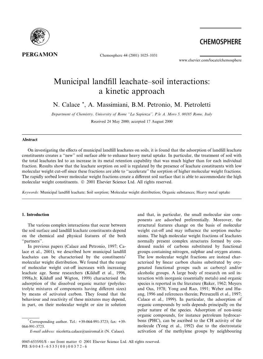研究垃圾渗滤液在土壤中的作用,我们发现(Calace 等,2001)垃圾渗滤液成分的吸附决定了重金属吸收的增加。仅较低分子量的组分存在增强金属吸收。来自“旧”放电的渗滤液中存在的较高分子量组分似乎不涉及增加土壤吸附过程。然而,当用总浸出液处理土壤时,土壤的金属保留能力的增加远大于每个组分获得的土壤的金属保留能力。在我们看来,这个结果可以用渗滤液与土壤的不同分子量分数之间的渗滤液成分相互作用机理来解释。