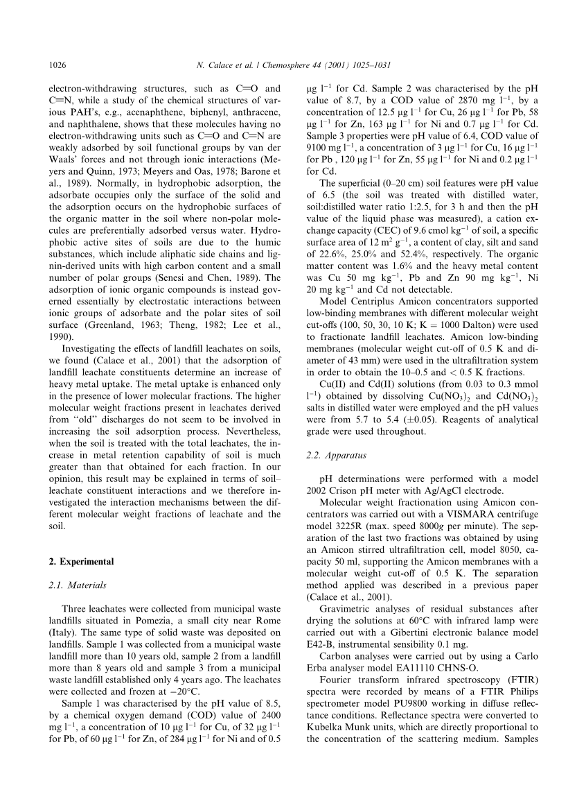 在以前的论文(Calace和Petronio,1997; Calace等,2001)中,我们论述了城市垃圾渗滤液如何通过组分的分子量分布来表征。我们发现分子量极限值的范围随渗滤液年龄的增加而增加。一些研究者(Kiduff等人,1996,1998a,b; Kiduff和Wigton,1999)发现了通过活性炭吸附溶解的有机物质(具有不同尺寸的组分的聚乙二醇单体混合物)。他们发现这些混合物的行为和反应性一定程度上取决于它们在溶液中的分子量或大小,特别是小分子的组分被优先吸收。此外,结构特征在分子量极限范围内发生变化,并且可能影响机制的吸附。渗滤液的高分子量组分通常是由通过含有氮,硫和氧的官能团取代的碳的缩合核形成的复杂结构原子。有研究表明对于低分子量组分其特征在于被氧化官能团如羧基和/或醇基团取代的直链碳链,也有大量关于土壤与无机(主要是金属)和有机物质相互作用的研究(Baker ,1962; Meyers and Oas,1978; Yong和Rao,1991; Weber和Huang,1996和其中的参考文献; Petruzzelli等,1997; Calace等,1999)。特别地,土壤中有机化合物的吸附主要取决于物种的极性。非离子有机化合物(如石油烃(PHC))的吸附可归因于静电的分子(Yong等人,1992)的CH活性,通过相邻的吸电子结构(如C = O和C = N)活化亚甲基,同时,对各种PAH(如苊,联苯,蒽和萘)的化学结构的研究表明,这些分子没有吸电子单元如C = O和C = N是土壤官能团通过范德华力微弱的吸附,而不是通过离子相互作用(Meyers和Quinn,1973; Meyers and Oas,1978:Barone 等人,1989)。通常,在疏水吸附中,吸附物仅占土壤表面,吸附发生在土壤中有机物质的疏水表面,其中非极性分子优先与水相吸。土壤的水力活性位点是腐殖质,其包括脂肪族侧链和具有高碳含量和少量极性基团的木质素衍生单元(Senesi和Chen,1989)。离子有机化合物的吸附取决于被吸附物的离子基团与土壤表面的极性位置之间的静电相互作用(Greenland,1963; Theng,1982; Lee等,1990)。