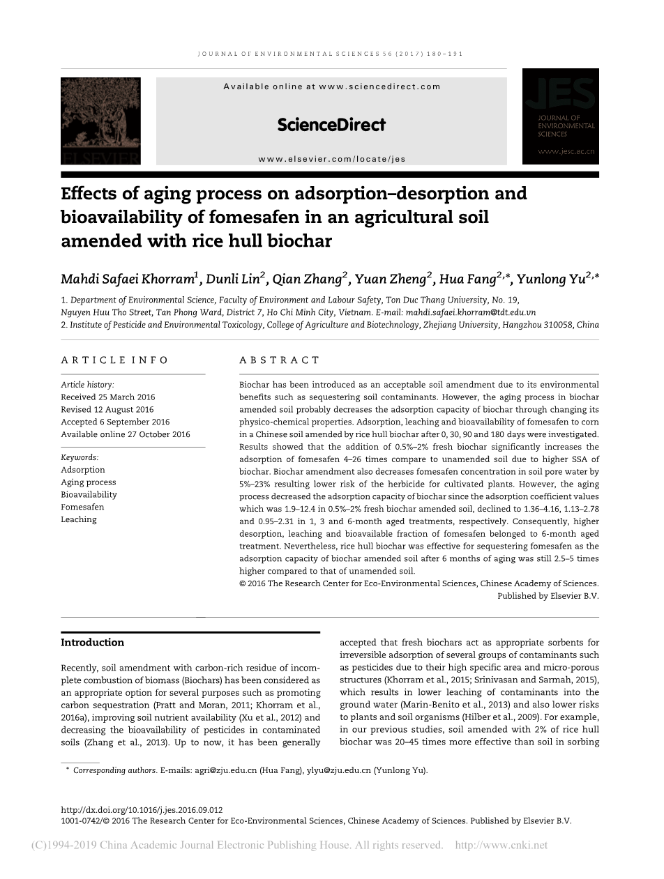 最近,生物质不完全燃烧的富碳残留物(Biochars)的土壤改良被认为是促进碳固存的几个目的的适当选择(Pratt和Moran,2011; Khorram等,2016a),改善土壤养分可用性(Xu等,2012)和降低污染土壤中农药的生物利用度(Zhang et al。,2013)。到目前为止,人们普遍认为新鲜的生物制剂可以作为适当的吸附剂,用于不可逆地吸附几组污染物,如农药,因为它们具有较高的比表面积和微孔结构(Khorram等,2015; Srinivasan和Sarmah, 2015),这导致污染物较少地浸入地下水中(Marin-Benito等,2013),同时降低了植物和土壤生物的风险(Hilber等,2009)。例如,在我们之前的研究中,用2%的稻壳生物炭修正的土壤在吸收fomesafen超浓缩范围0.5-8 mg / L时比土壤有效20-45倍(Khorram等,2015)。在另一项研究中,Yang等人。(2010)报道,与对照处理相比,1%棉草生物炭修正值使韭菜(Allum tuberosum)中氯吡格雷和氟虫腈的总残留量分别减少了81%和52%。