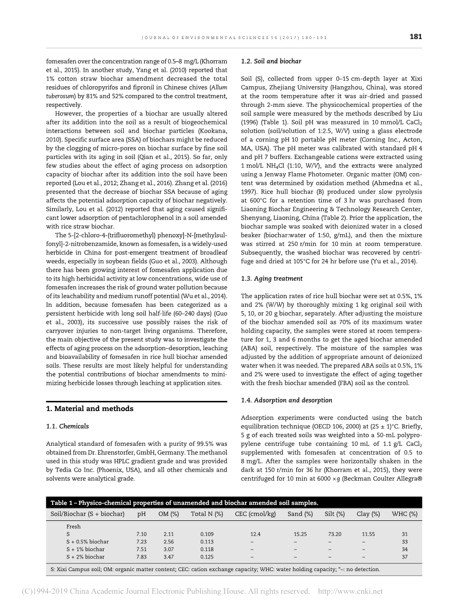 5- [2-氯-4-(三氟甲基)苯氧基] -N- [甲磺酰基] -2-硝基苯甲酰胺,被称为氟沙芬,是中国广泛使用的除草剂,用于阔叶杂草的后期处理,特别是在大豆田中( Guo等,2003)。虽然由于其在低浓度下的高除草活性,对氟磺胺草醚的应用越来越感兴趣,但由于其可浸出性和中等径流潜力,广泛使用氟磺胺草素会增加地下水污染的风险(Wu等,2014)。此外,由于fomesafen已被归类为具有长土壤半衰期(60-240天)的持久性除草剂(Guo等人,2003),因此其连续使用可能会增加非靶标生物体携带伤害的风险。因此,本研究的主要目的是研究老化过程对水稻壳生物炭改良土壤中氟磺胺草醚的吸附 - 解吸,浸出和生物有效性的影响。这些结果很可能有助于了解生物炭修正案通过在施用地点浸出来最大限度地减少除草剂损失的潜在贡献。