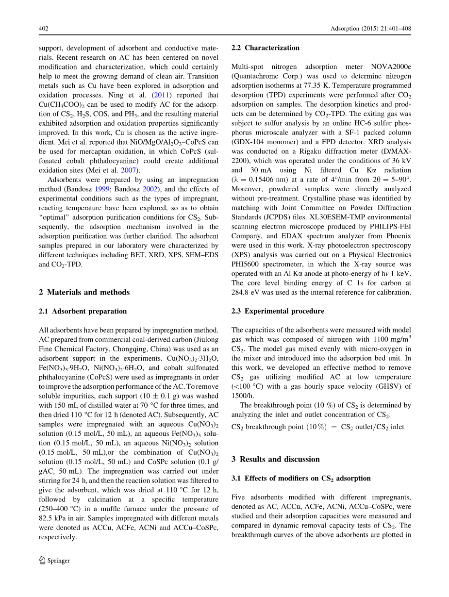 吸附剂是用浸渍法制备的(班多斯,1999年;Bandosz,2002),并探索了实验条件如浸渍剂类型、反应温度的影响,以便获得CS2的“最佳”吸附纯化条件。进一步阐明了吸附净化过程中涉及的吸附机理。用BET、XRD、XPS、扫描电镜和CO2-TPD等技术对实验室制备的吸附剂样品进行了表征。