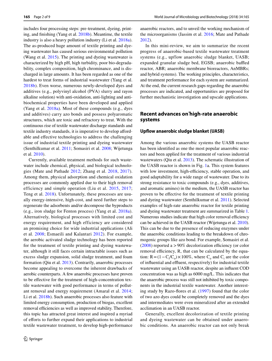 在这篇简短的综述中,我们的目标是总结最近的厌氧纺织废水处理的进展(例如,上流式厌氧污泥床,UASB,膨胀颗粒污泥床,EGSB,厌氧bafABR反应器;厌氧膜生物反应器和混合动力系统)。人们通过对厌氧工作原理以及各系统的处理性能的总结后,对厌氧菌的研究现状进行了展望,并提出了机会进一步的机械研究和高端应用。