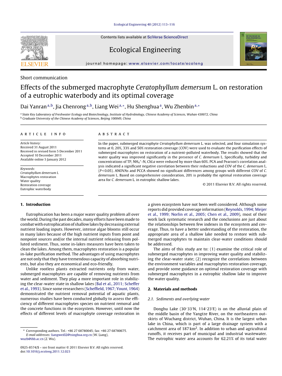 关键词:金鱼藻;大型植物恢复 ;水质 ; 恢复程度;富营养化水体