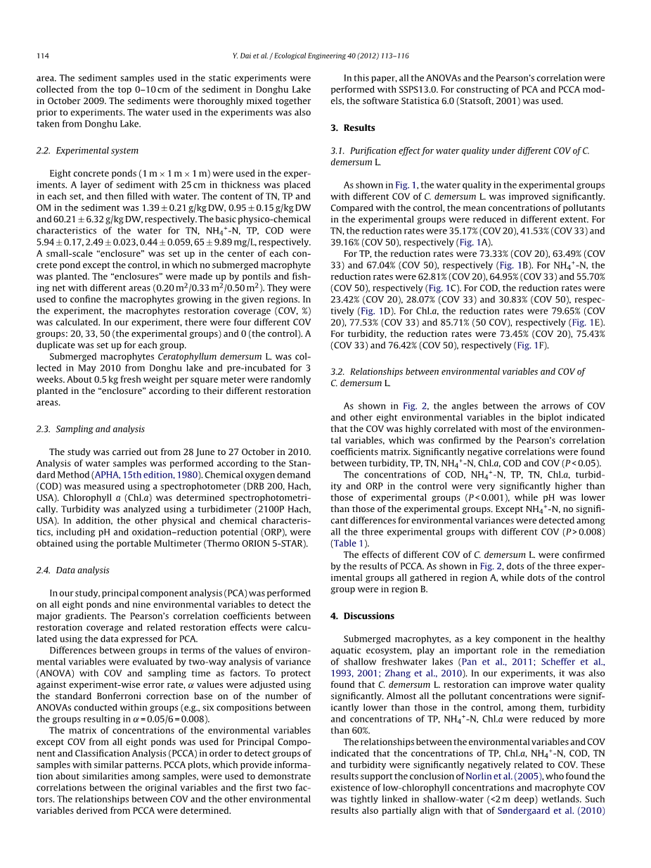 沉水植物作为健康水生生态系统的关键组成部分,在浅水淡水湖泊修复中发挥着重要作用[[9][[10][[11]](Pan et al。,2011; Scheffer et al。,1993,2001; Zhang et al。,2010)。 在我们的实验中,还发现金鱼藻修复体可以显着改善水质。几乎所有污染物浓度均显着低于对照组,其中浊度和TP,NH4 -N,Chl.a浓度降低了60%以上。
