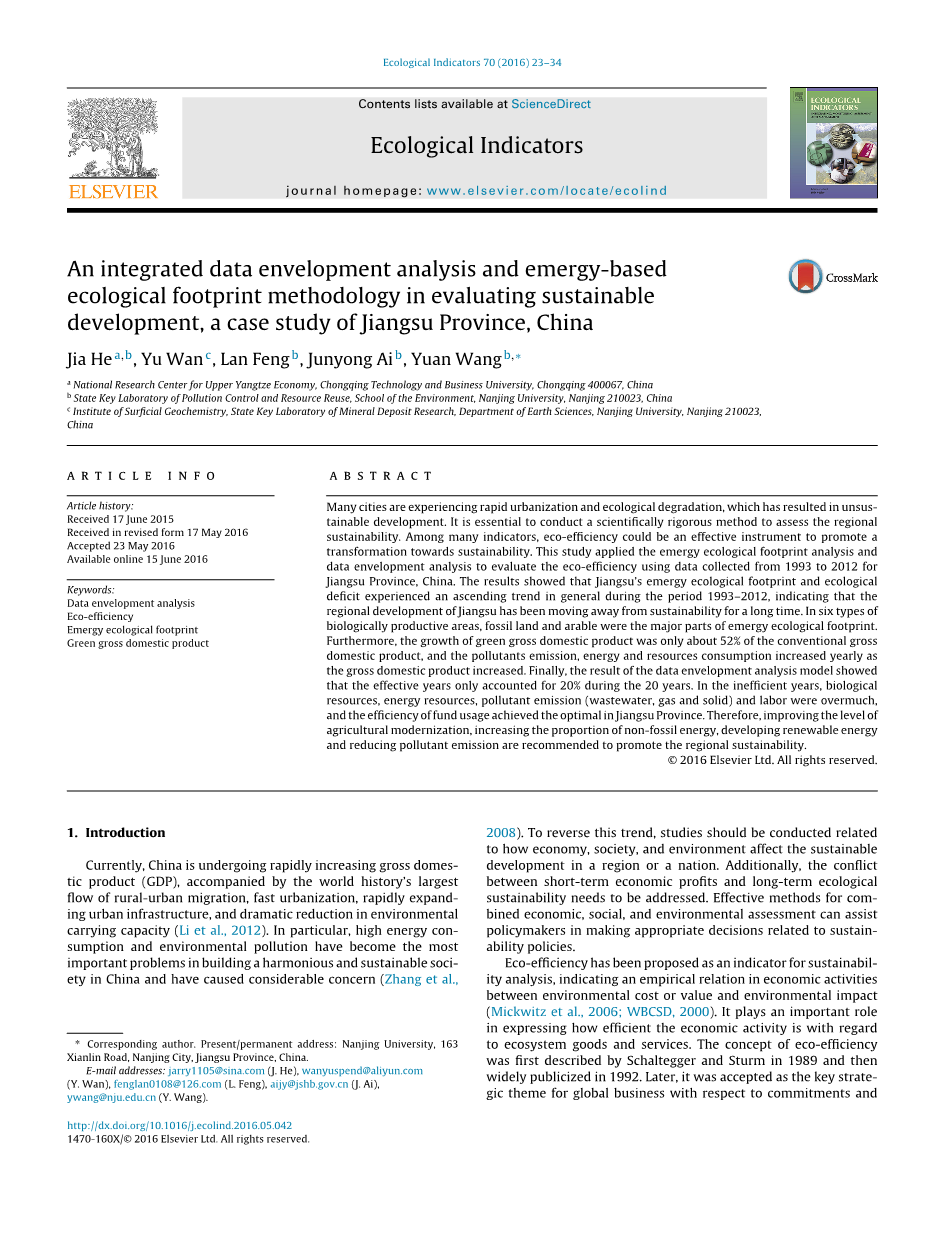 综合数据包络分析和基于能量的生态足迹方法论评估可持续发展,中国江苏省的案例研究