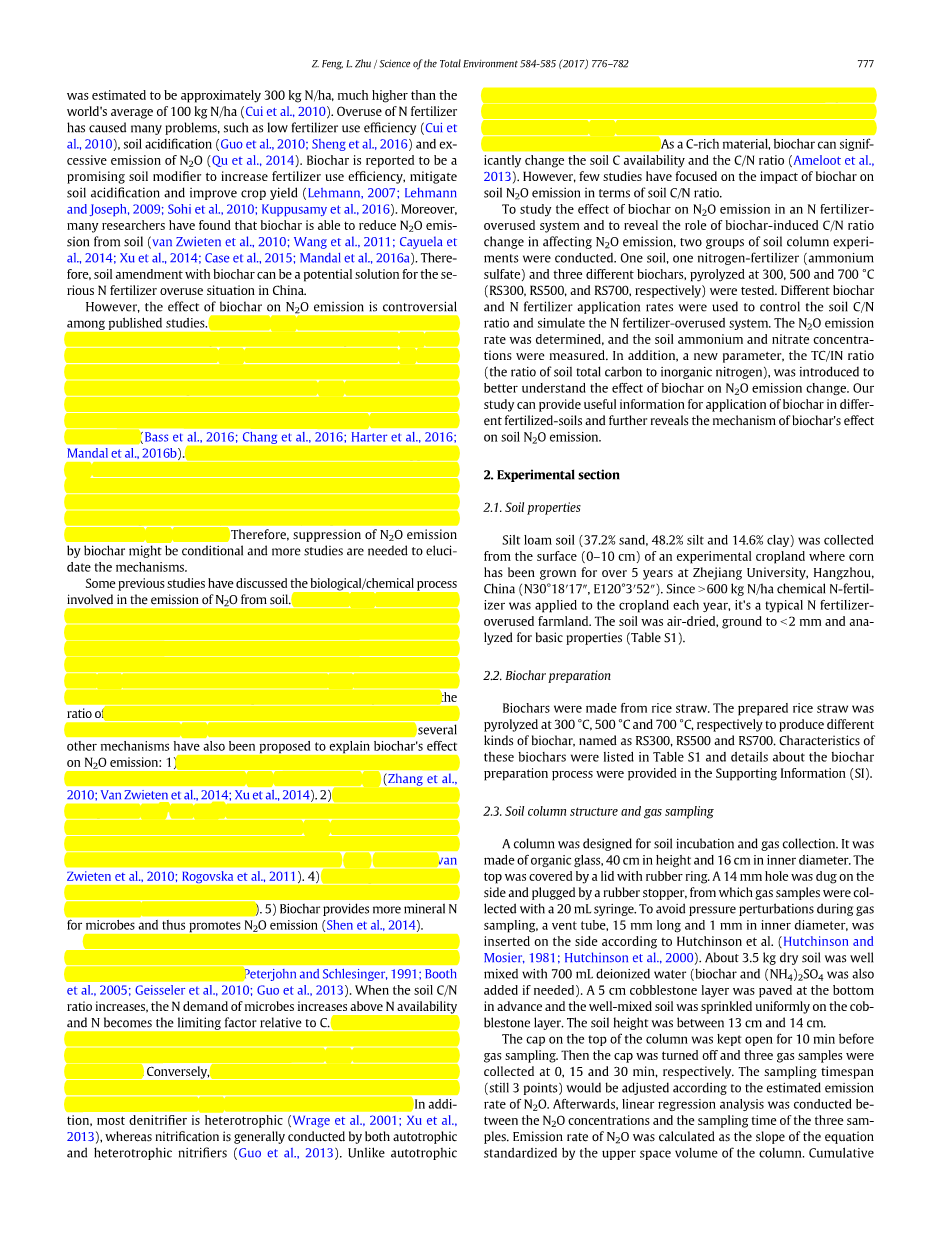 氮肥的过度使用(N肥)在中国是一个严重的问题。中国农田平均氮肥施用率估计约为300公斤/公顷, 远高于世界平均100公斤/公顷 (Cui等, 2010)。氮肥施用过量造成了肥料使用效率低下 (Cui等)、土壤酸化 (Guo等,2010; Sheng等,2016) 和N2O的过量排放 (Qu等, 2014)等诸多问题。据报道, 生物炭是一种很有前途的土壤改性剂, 可提高肥料使用效率, 减少土壤酸化, 提高作物产量 (Lehmann, 2007; Lehmann and Joseph, 2009; Sohi等, 2010; Kuppusamy等, 2016)。此外,许多研究人员已经发现生物炭能够减少N2O排放 (van Zwieten等,2010; Wang等,2011; Cayuela等,2014; Xu等,2014; Case等,2015; Mandal等,2016a)。因此,生物炭改良土壤可能是应对中国氮肥严重过量使用现状的一个潜在的解决方案。