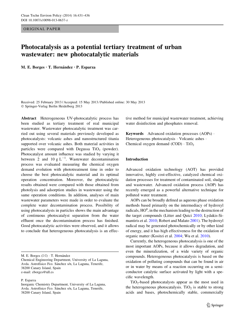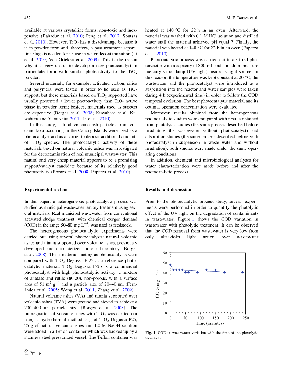 2. Borges ME, Alvarez-Galva acute;n MC, Esparza P, Medina E, Martı acute;n-Zarza P, Fierro JLG (2008) Ti-containing volcanic ash as photocatalyst for degradation of phenol. Energy Environ Sci 1:364–369