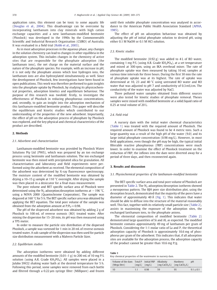 在实验室阶段和现场阶段中,已经对镧改性膨润土锁磷剂对人造废水和实际废水中对磷的吸收有研究。在实验测试中,平衡和动力学在不同的温度,离子浓度和pH条件下被研究。吸附过程的活化能计算基于其速率常数。吸附容量在pH处于5~7时取得最大,随着pH的升高,吸附容量减小。单价磷酸根阴离子H2PO4-对吸附表面具有最大的吸引力。而且,活化能由于在在高pH溶液中的吸附位点减少同时又不受溶液离子浓度影响而更低。现场测试也证明锁磷剂在去除污水中磷的效果很好。