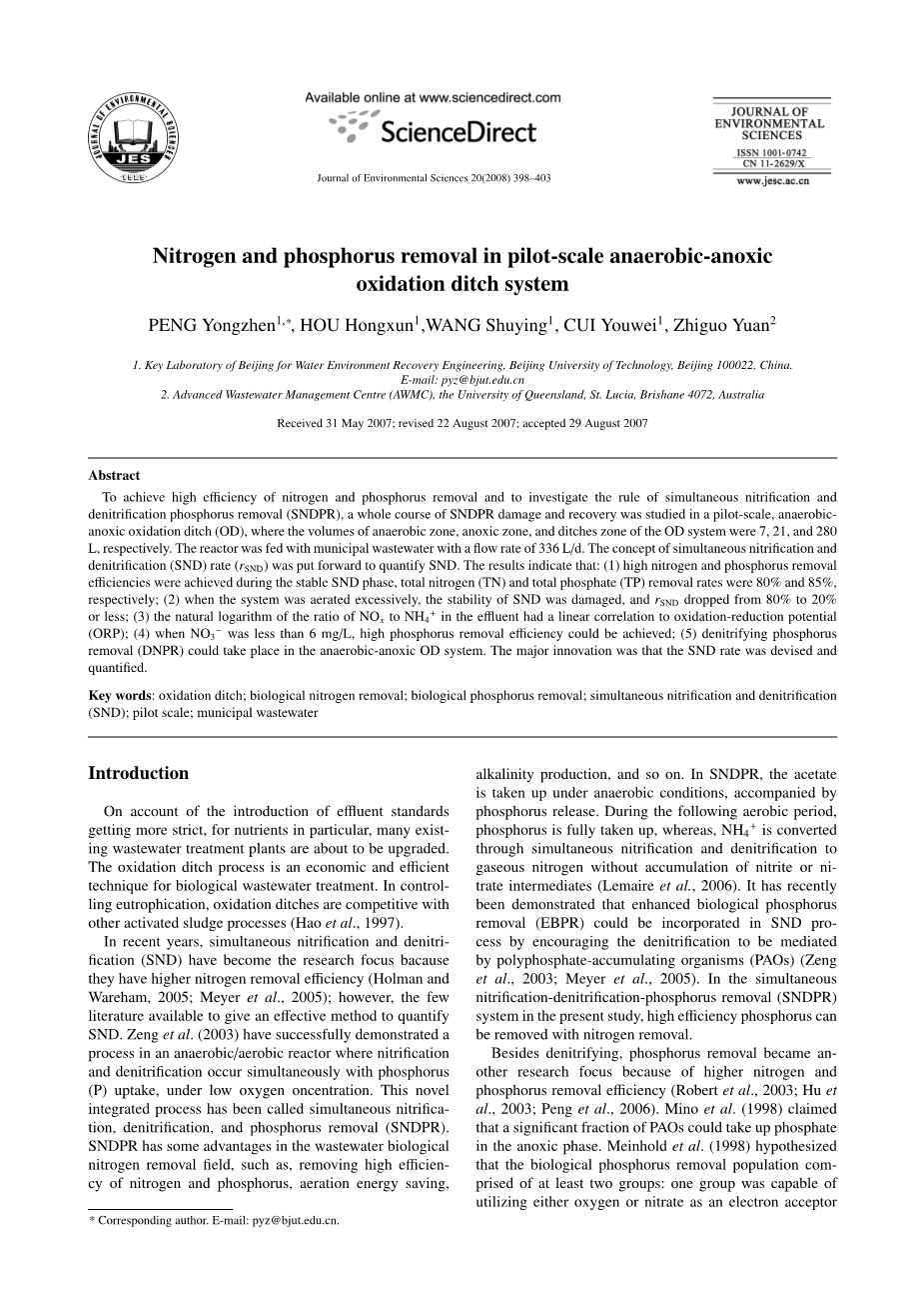 关键词:氧化沟;生物脱氮;生物除磷;同时硝化和反硝化;中试阶段;城市污水