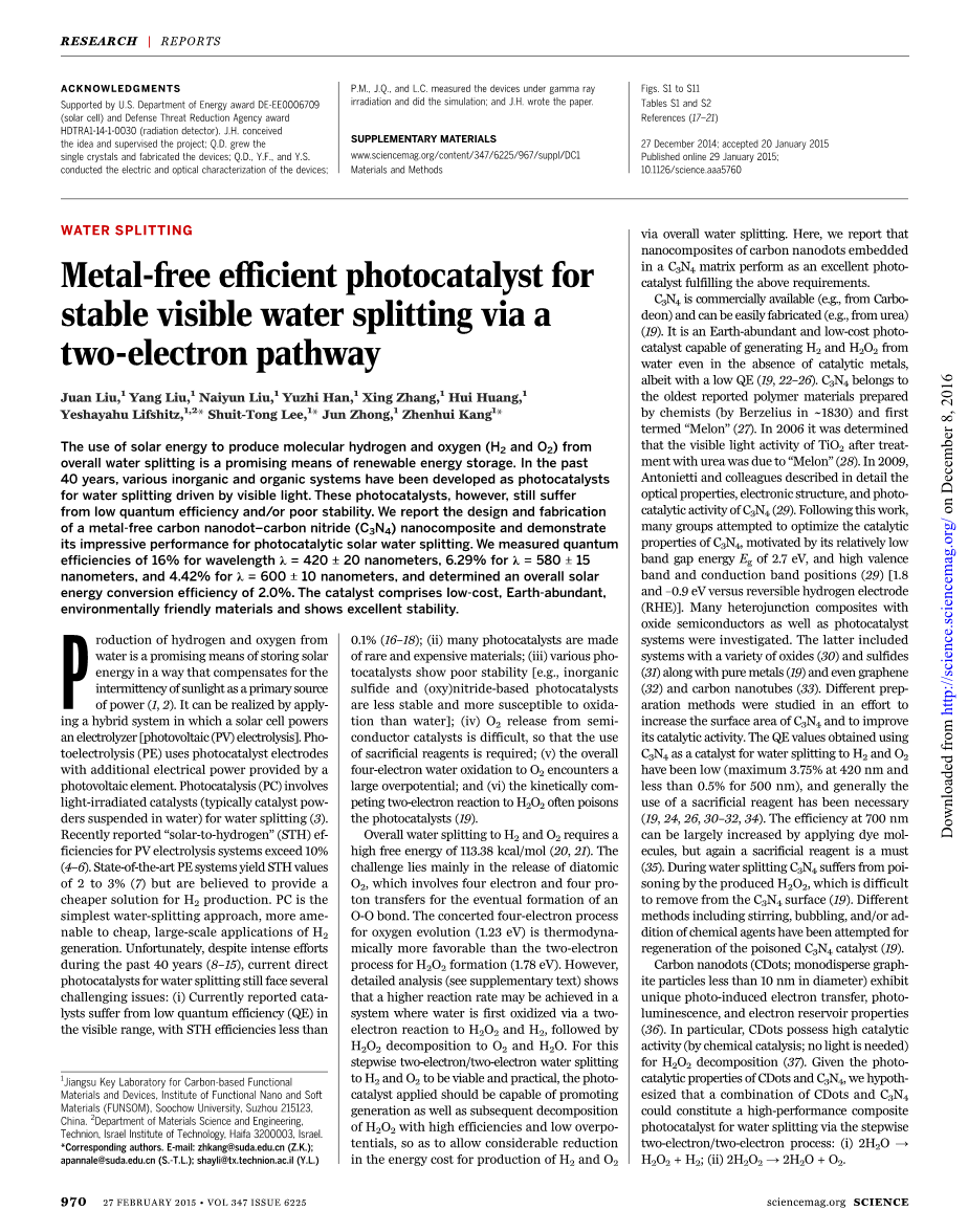 水裂解成H2和O2需要高达113.38kcal / mol的自由能(20,21)。挑战主要在于二原子O2的释放,其涉及四个电子和四个质子转移以最终形成O-O键。用于氧析出的四电子过程(1.23eV)在热力学上比用于H2O2形成的双电子过程(1.78eV)更有利。然而,详细分析(参见补充文本)表明,水通过两电子反应首先被氧化成H2O2和H2,随后H2O2分解成O2和H2O的系统中可以实现更高的反应速率。为了使这种逐步的双电子/双电子水分裂为H2和O2变得可行和实用,所应用的光催化剂应当能够促进具有高效率和低过电位的H2O2的产生以及随后的分解,这样可以大大降低通过水分裂生产H2和O2的能量成本。在这里,我们报告了嵌入在C3N4基体中的碳纳米点的纳米复合材料作为一个优秀的光催化剂满足上述要求。