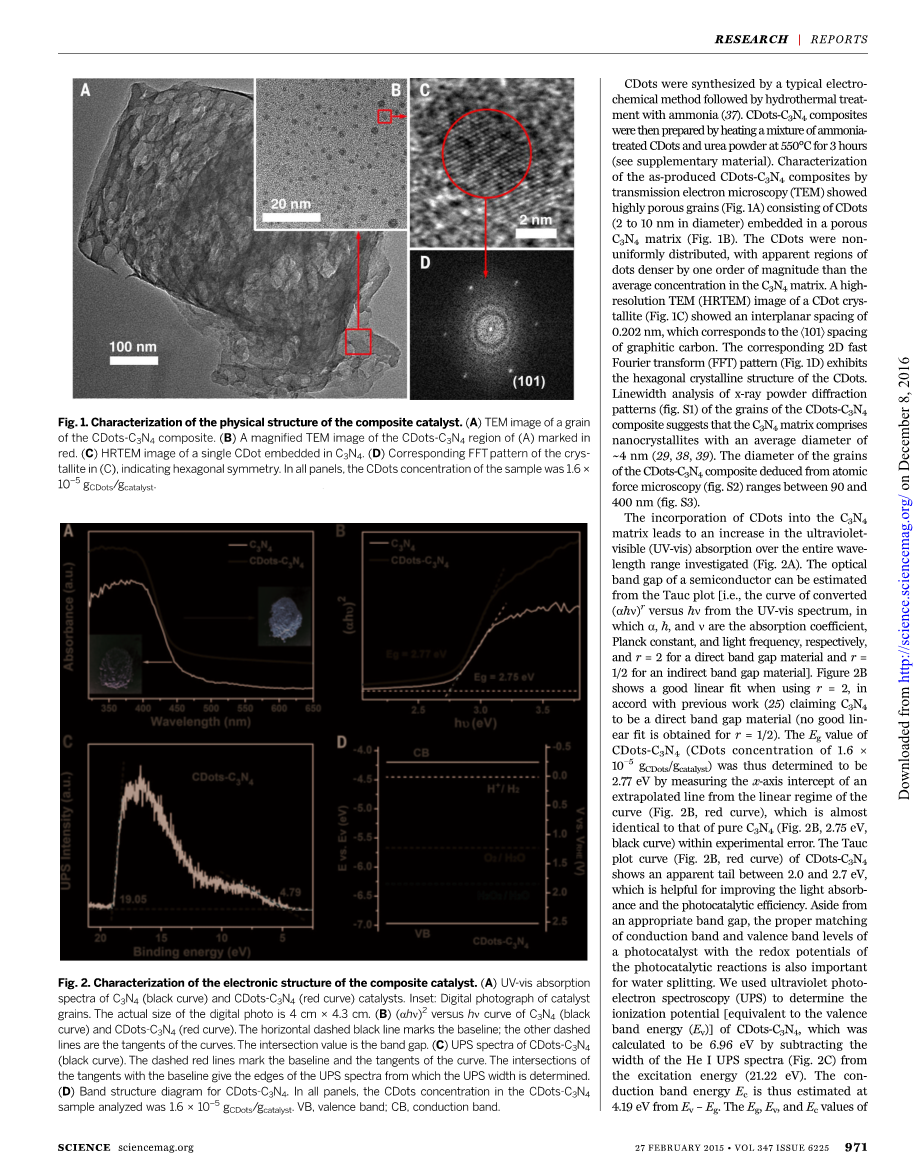 碳纳米点(CDots;直径小于10nm的单分散石墨颗粒)具有独特的光诱导电子转移,光致发光和电子储存性质(36)。 特别需要指出,CDots对H2O2分解具有较高的催化活性(通过化学催化;不需要光)(37)。 考虑到CDots和C3N4的光催化性能,我们假设CDots和C3N4的组合可以构成通过逐步双电子过程裂解水的高性能复合光催化剂:(i)2 H2O→H2O2 H2; (ii)2 H2O2→2 H2O O2。