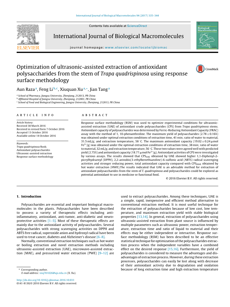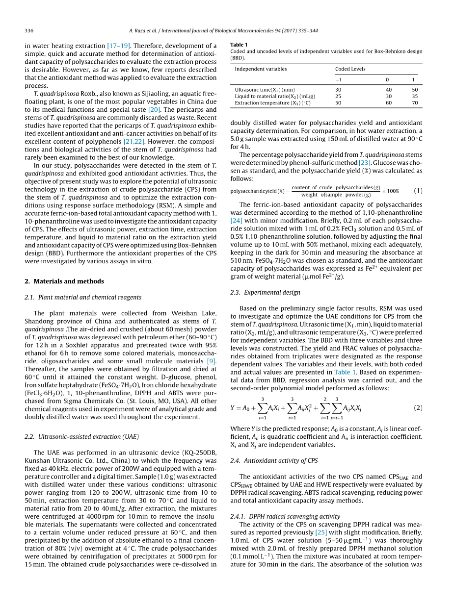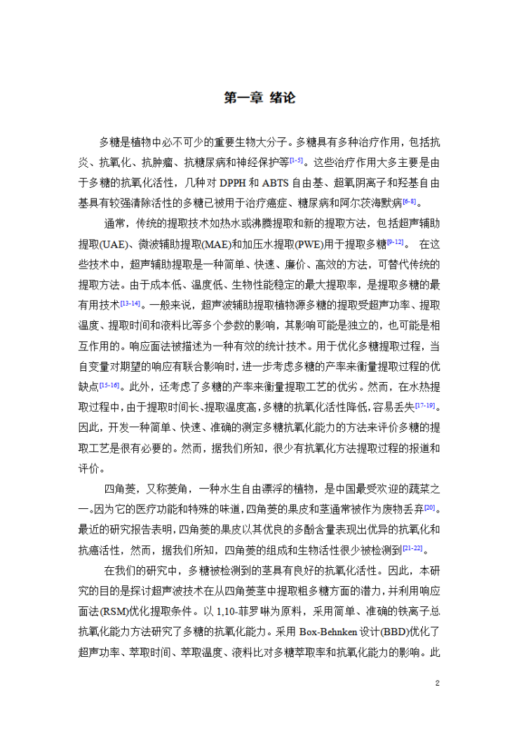 - 利用响应面法优化超声波辅助提取四角菱茎多糖 和抗氧化活性的研究外文翻译资料