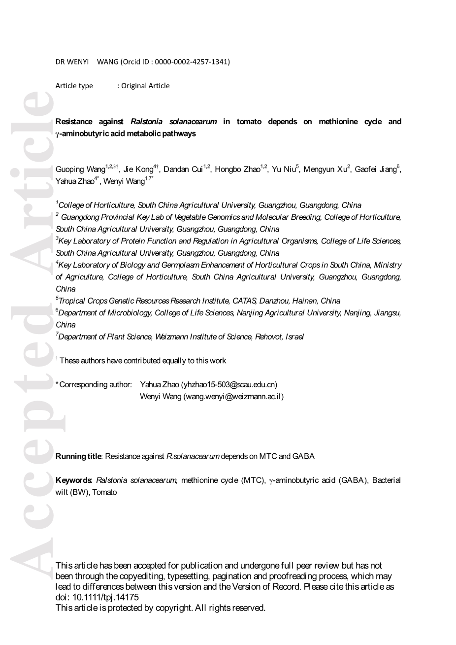 关键词:青枯菌;蛋氨酸循环(MTC);rsquo;gamma;-氨基丁酸(GABA);细菌枯萎病(BW);番茄