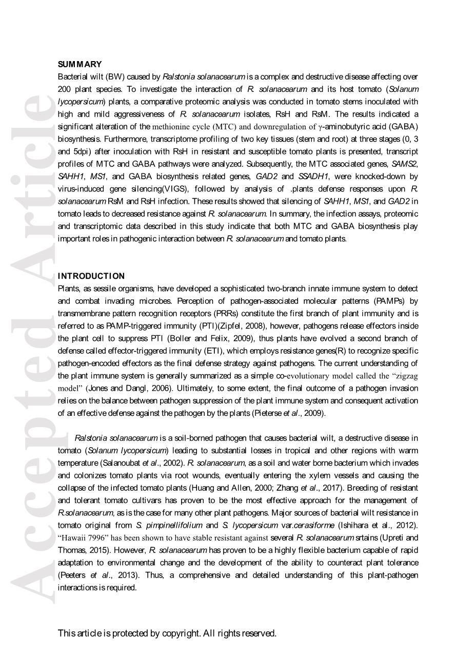 细菌性萎蔫病是由青枯病引起的一种复杂的破坏性病害,影响到200多种植物。本研究为研究青枯病与寄主番茄的相互作用,用具有高度感染青枯病(RsH)、轻度感染青枯病(RsM)分别侵染番茄茎进行了蛋白质组学比较分析。结果表明,甲硫氨酸循环发生明显改变,gamma;-氨基丁酸生物合成水平降低。接下来,作者还对抗性番茄和感病番茄接种(RsH)后3个阶段(0、3和5 dpi)的两个关键组织(茎和根)进行了转录组分析。分析了MTC和GABA通路的特征。随后,MTC相关基因SAMS2, SAHH1, MS1,以及GABA生物合成相关基因GAD2和SSADH1,被病毒诱导的基因沉默(VIGS)表达,随后对对RSM和RSH感染的防御反应过程中MTC相关基因进行了分析。结果表明,番茄SAHH 1、MS1和GAD 2的沉默导致番茄抗性下降。总之,本研究中描述的感染分析、蛋白质组学和转录数据表明,MTC和GABA生物合成在青枯病和番茄免疫互做中起到重要调控作用。