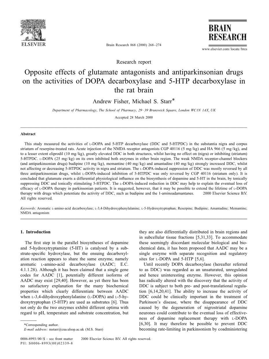 谷氨酸拮抗剂和抗帕金森药物对大鼠脑部多巴脱羧酶和5-羟色氨酸脱羧酶的相反的影响