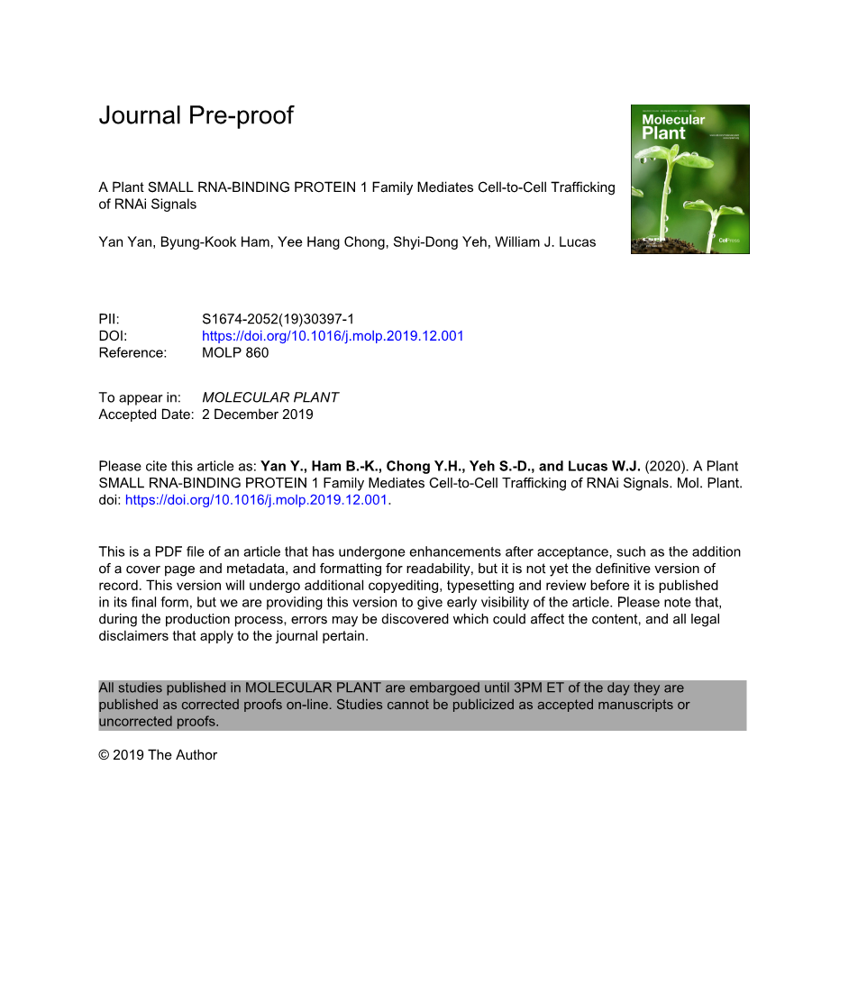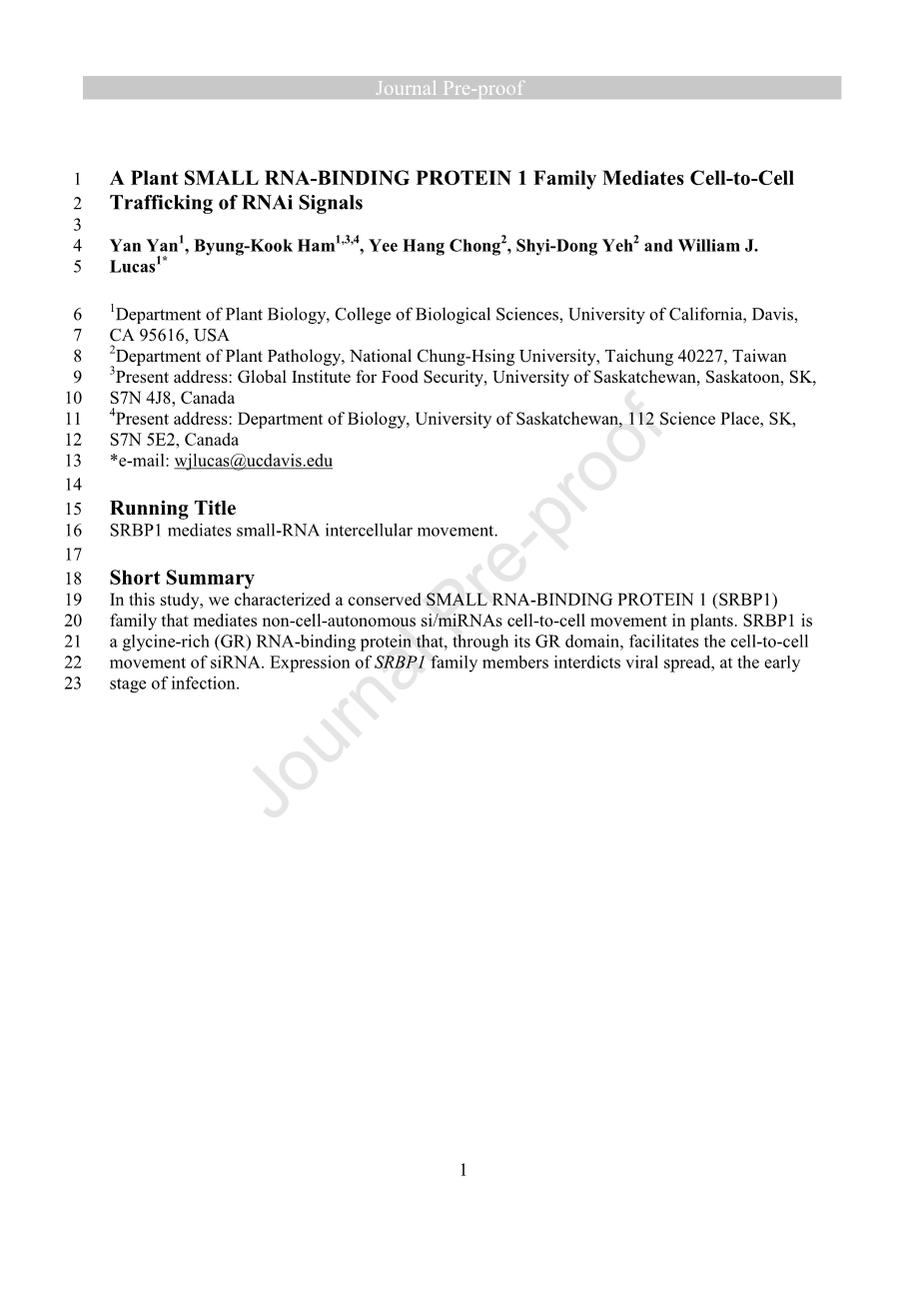 保守的小RNA结合蛋白(SRBP1)家族的特性研究,该家族在介导植物的非细胞自主siRNA转运中起作用。
