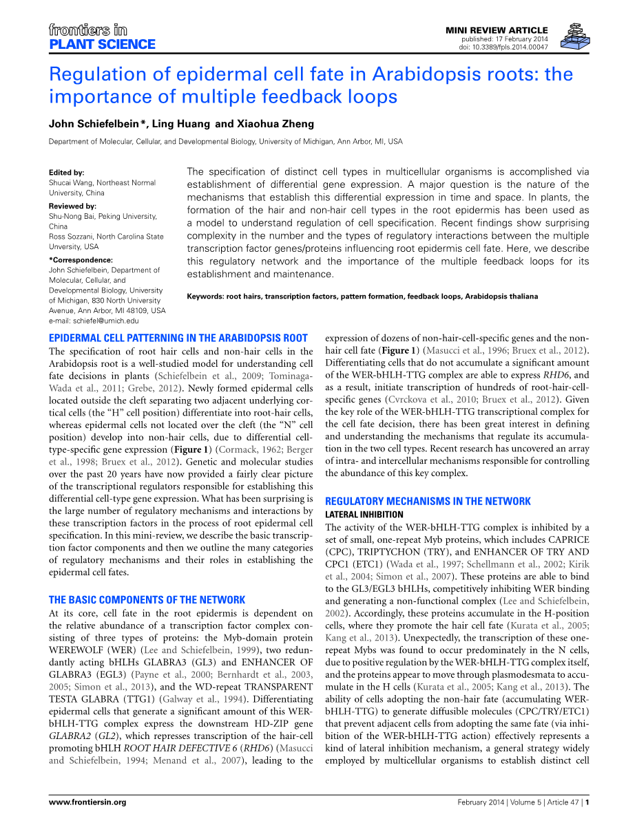 [1] Schiefelbein, J., Kwak, S. H., Wieckowski, Y., Barron, C., and Bruex, A. (2009). The gene regulatory network for root epidermal cell-type pattern formation in Arabidopsis. J. Exp. Bot. 60: 1515–1521.