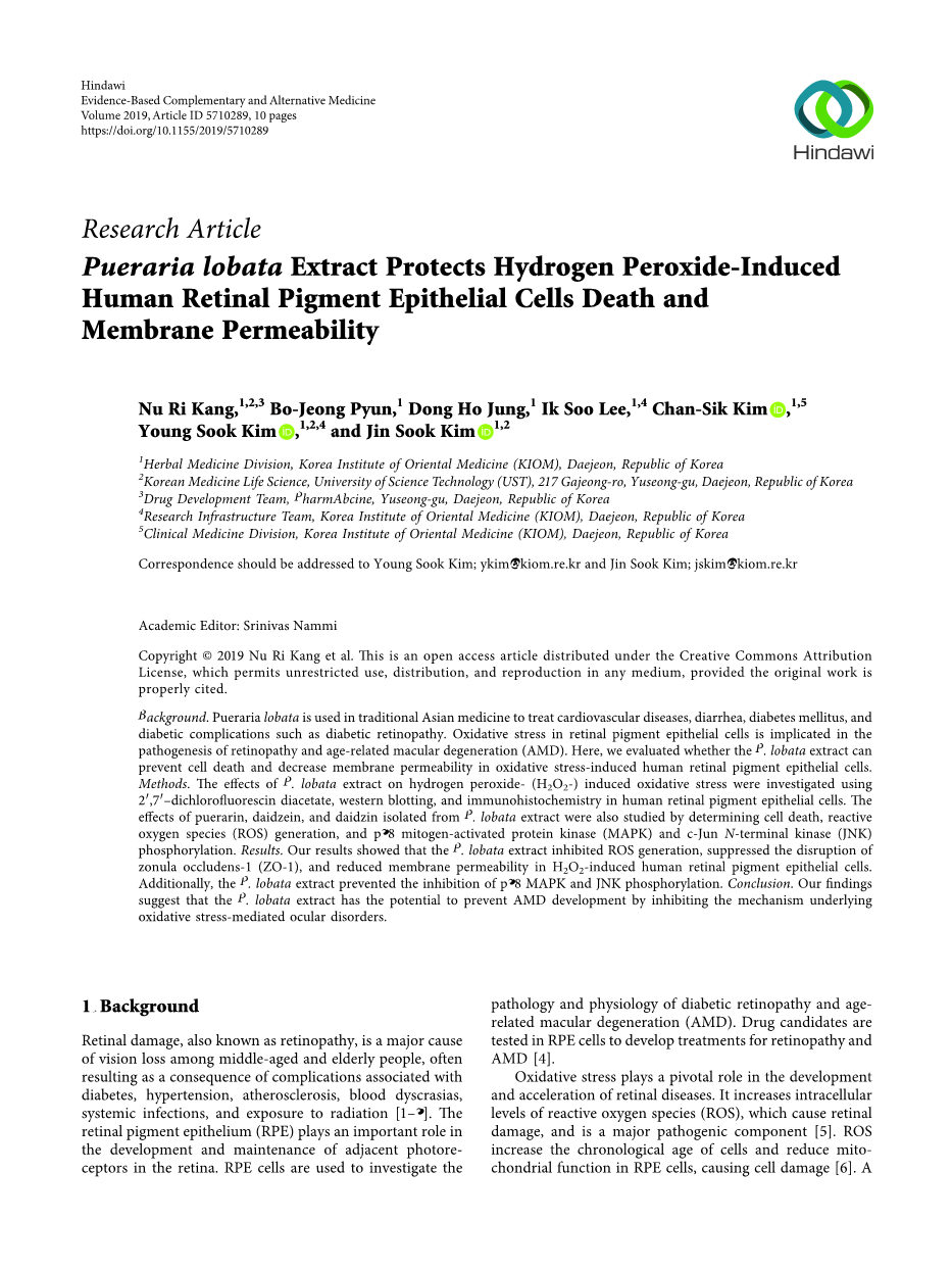葛根提取物可保护由过氧化氢引起的人视网膜色素上皮细胞死亡和膜通透性改变