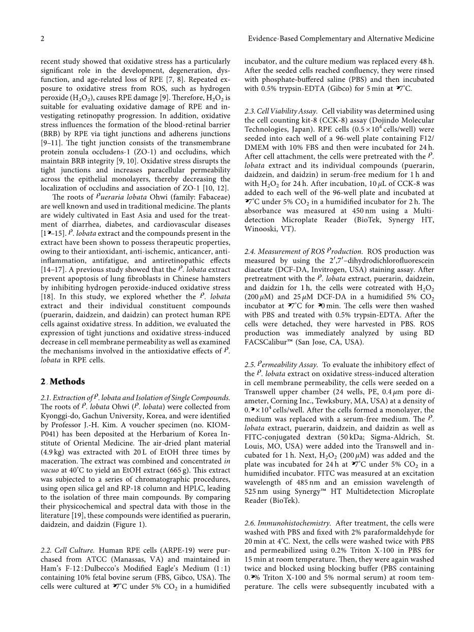 葛根是众所周知的广泛用于传统医学的一种药物。葛根在东亚地区有广泛种植,用于治疗腹泻、糖尿病和心血管疾病[13–15]。葛根提取物和提取物中的化合物由于其抗氧化、抗缺血、抗癌、抗炎症、抗疲劳和抗视网膜病变作用,已被证明具有治疗特性[14–17]。既往研究表明,葛根提取物通过抑制过氧化氢诱导的氧化应激来抑制中国仓鼠肺成纤维细胞凋亡[18]。在本研究中,我们探讨了葛根提取物及其单独的组成化合物(葛根素、大豆苷元和大豆苷)是否能保护人RPE细胞免受氧化应激。此外,我们还评估了紧密连接的表达和氧化应激诱导的细胞膜通透性的降低,并研究了葛根提取物在RPE细胞中抗氧化作用的机制。