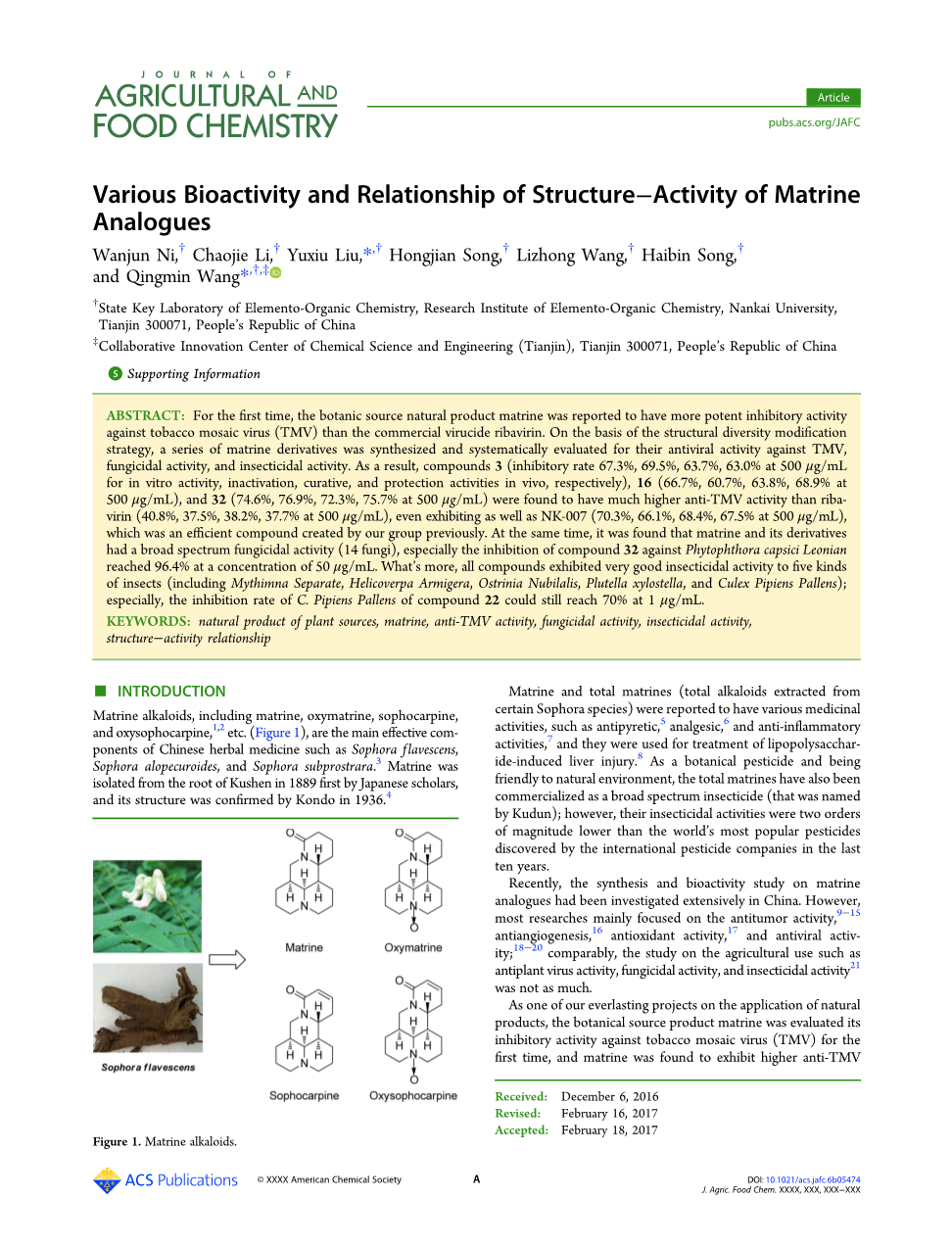 最近,中国广泛研究了苦参碱类似物的合成和生物活性。然而,大多数研究主要集中于抗肿瘤活性,抗血管生成,抗氧化活性和抗病毒活性; 相比之下,关于农业方面使用(如植物病毒活性,杀真菌活性和杀虫活性)的研究没有那么多。