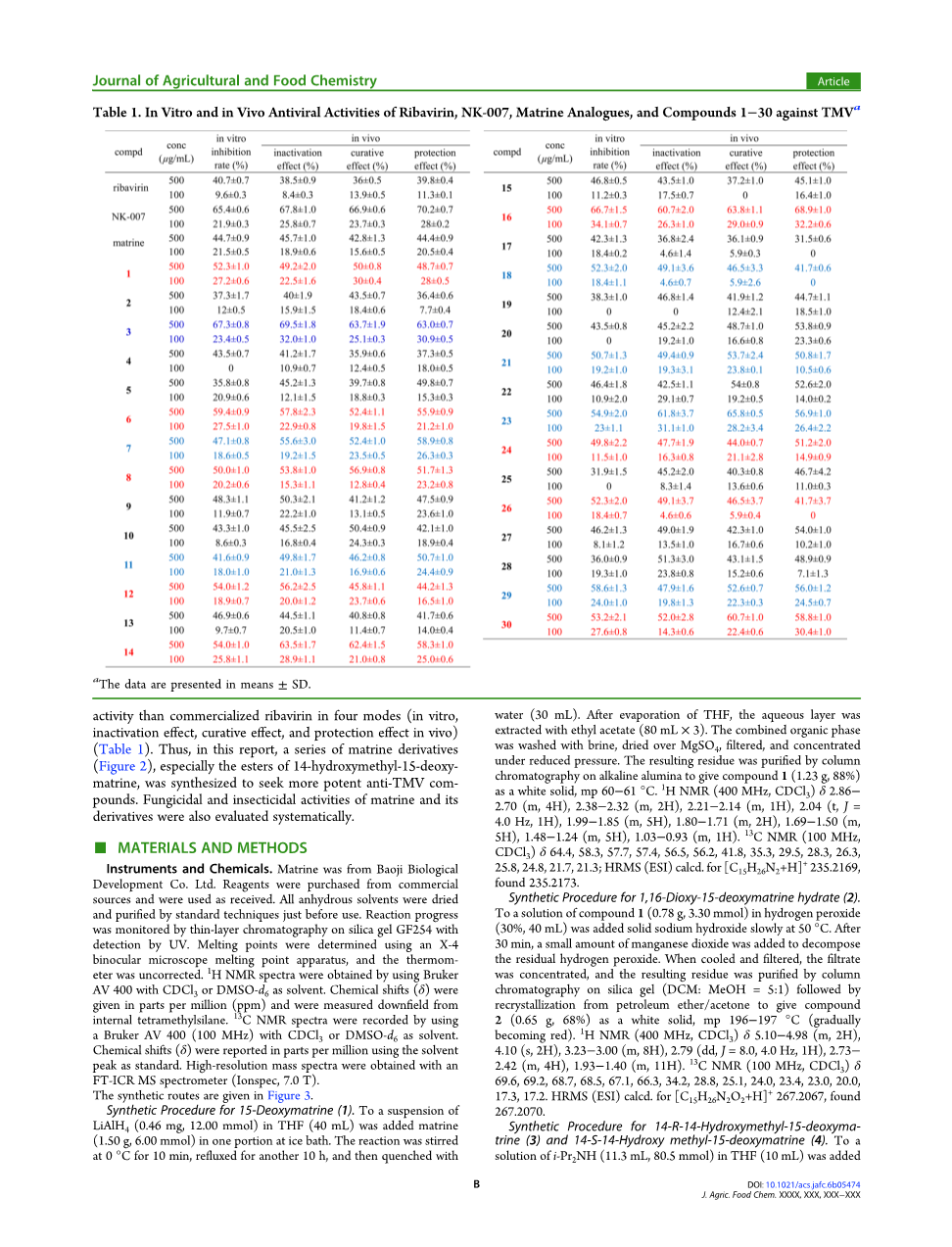 作为我们一个关于应用天然产品的永久项目,首次评估了植物源产品苦参碱对烟草花叶病毒(TMV)的抑制活性,并且发现苦参碱在四种模式下表现出比商业化的杀病毒剂利巴韦林更高的抗TMV活性(体外,灭活效应,治疗效应和体内保护效应)(表1)。因此,在本报告中,合成了一系列苦参碱衍生物(图2),特别是14-羟甲基-15-脱氧苦参碱酯,以寻找更有效的抗TMV化合物。还系统评价了苦参碱及其衍生物的杀真菌和杀虫活性。