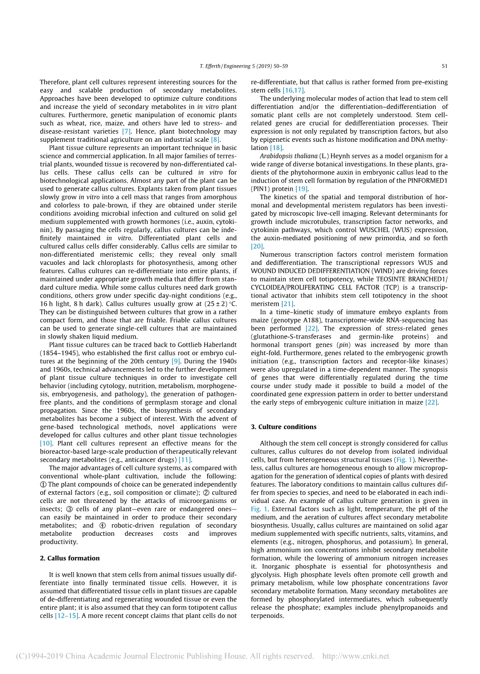 虽然在愈伤组织培养中,干细胞的概念得到了充分的考虑,但愈伤组织培养不是从孤立的单个细胞发展而来,而是从异质结构组织而来的(图1)。然而,愈伤组织培养很均匀,足以使微繁殖产生相同的带有所需特征的植物副本。维持愈伤组织培养的实验室条件因物种而异,需要在每个个案中加以详细说明。愈伤组织培养产生的一个例子如图1所示。外部因素如光、温度、培养基的pH值和培养物的通气情况影响次生代谢产物的生物合成。通常,愈伤组织在在固体琼脂培养基上进行培养,培养基中添加特定营养素、盐、维生素和元素(如氮、磷和钾)。一般来说,高浓度的铵离子会抑制次生代谢产物形成,而铵态氮的降低会增加次生代谢产物。无机磷酸盐对光合作用和糖酵解至关重要。高磷酸盐水平通常促进细胞生长和初级代谢,而低磷酸盐浓度有利于次生代谢产物形成。许多次生代谢产物是由磷酸化中间体形成的,这些中间体随后释放磷酸盐,如苯丙类和萜类化合物。