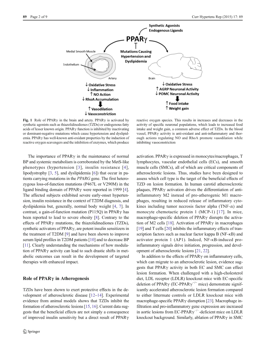 图1 PPARgamma;在脑和动脉中的作用。PPARgamma;功能由于灭活或显性负突变被抑制会引起高血压和血脂异常。PPARgamma;的抗氧化性质是通过诱导活性氧清除剂和抑制酶获得,此性质可以产生活性氧,这导致了特定神经元群体活动的增加和减少,也引起食物摄入和体重的增加,这是TZD的常见不良反应。在血管,PPARgamma;的活性主要是抗氧化、抗炎和广泛的调节NO和RhoA促进血管舒张且抑制血管收缩作的作用。