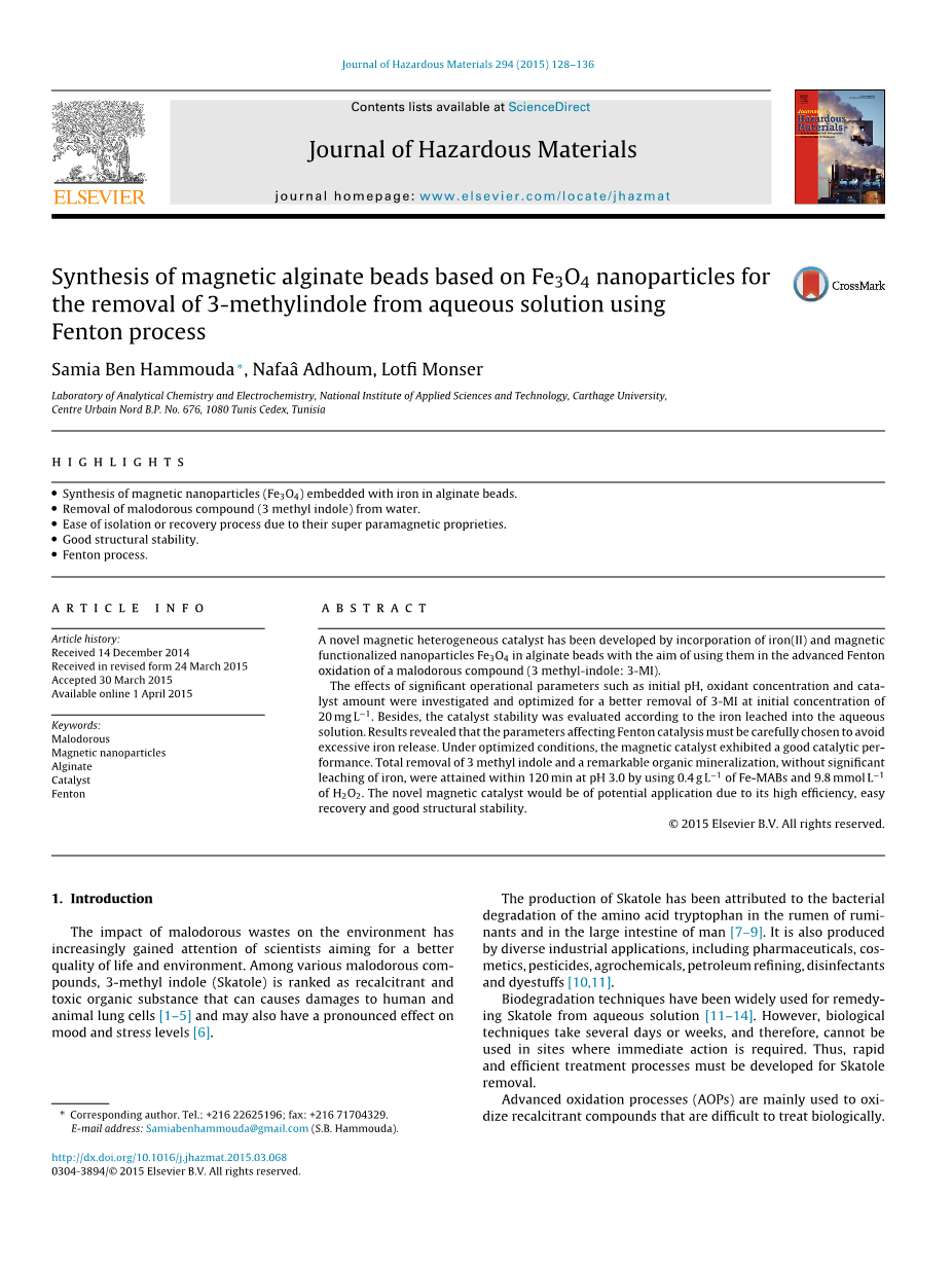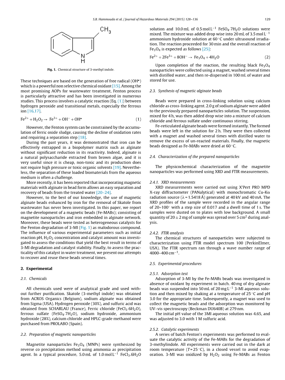 据我们所知,使用铁增强磁性的藻酸盐珠粒从废水中除去3-甲基吲哚的实验从未进行过研究。在本文中我们将报告磁珠(Fe-MABs)的研究发展;把磁性纳米颗粒包埋在海藻酸钠与铁组成的网状结构。此外,这些磁珠作为芬顿法降解恶臭化合物3-甲基吲哚(图1)的催化剂进行实验。各实验参数如初始反应pH,H2O2浓度和催化剂用量对3-甲基吲哚的降解和催化剂稳定性的影响进行测试评估。最后,为了评估这种催化剂在水处理中的实用性,我们尝试回收和多次重复使用这些磁珠。