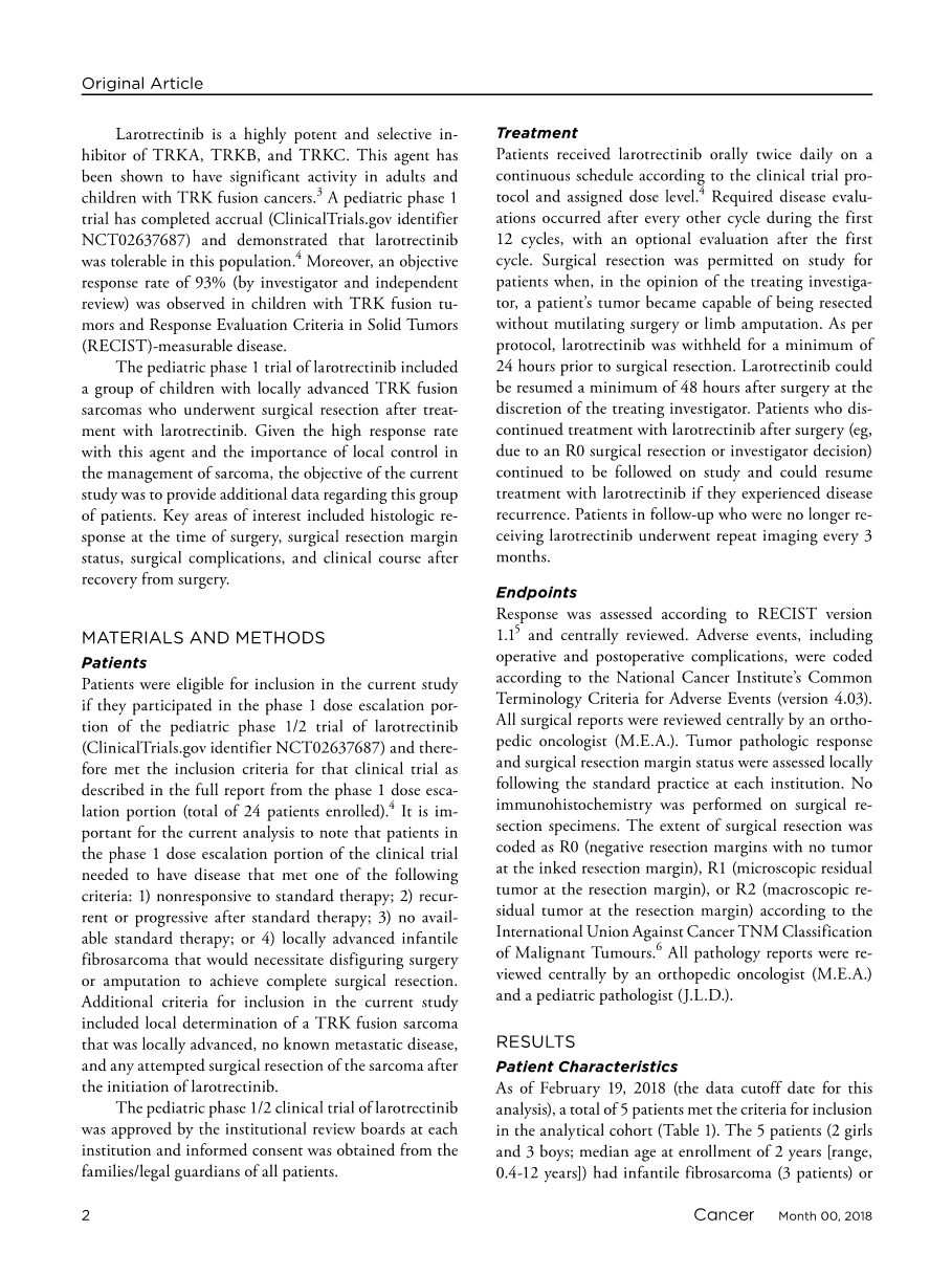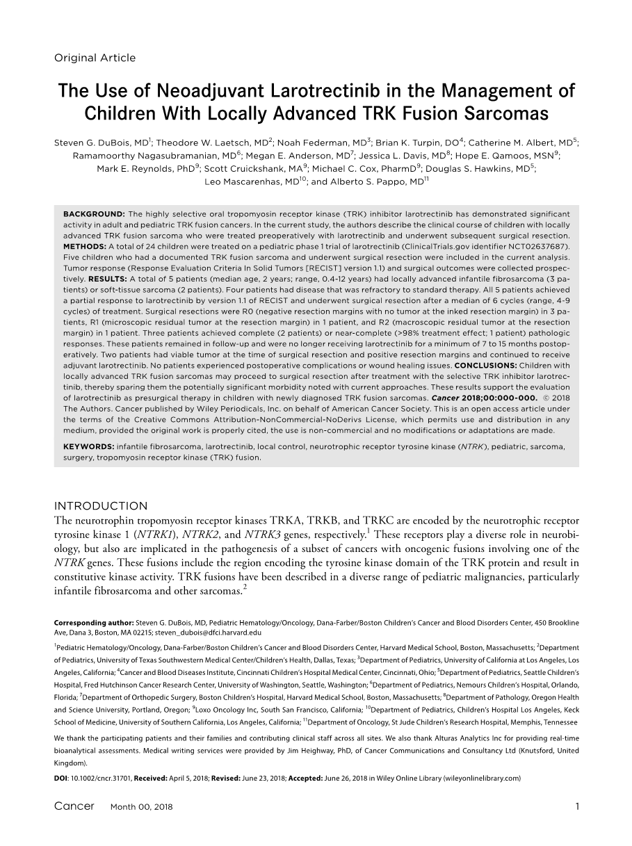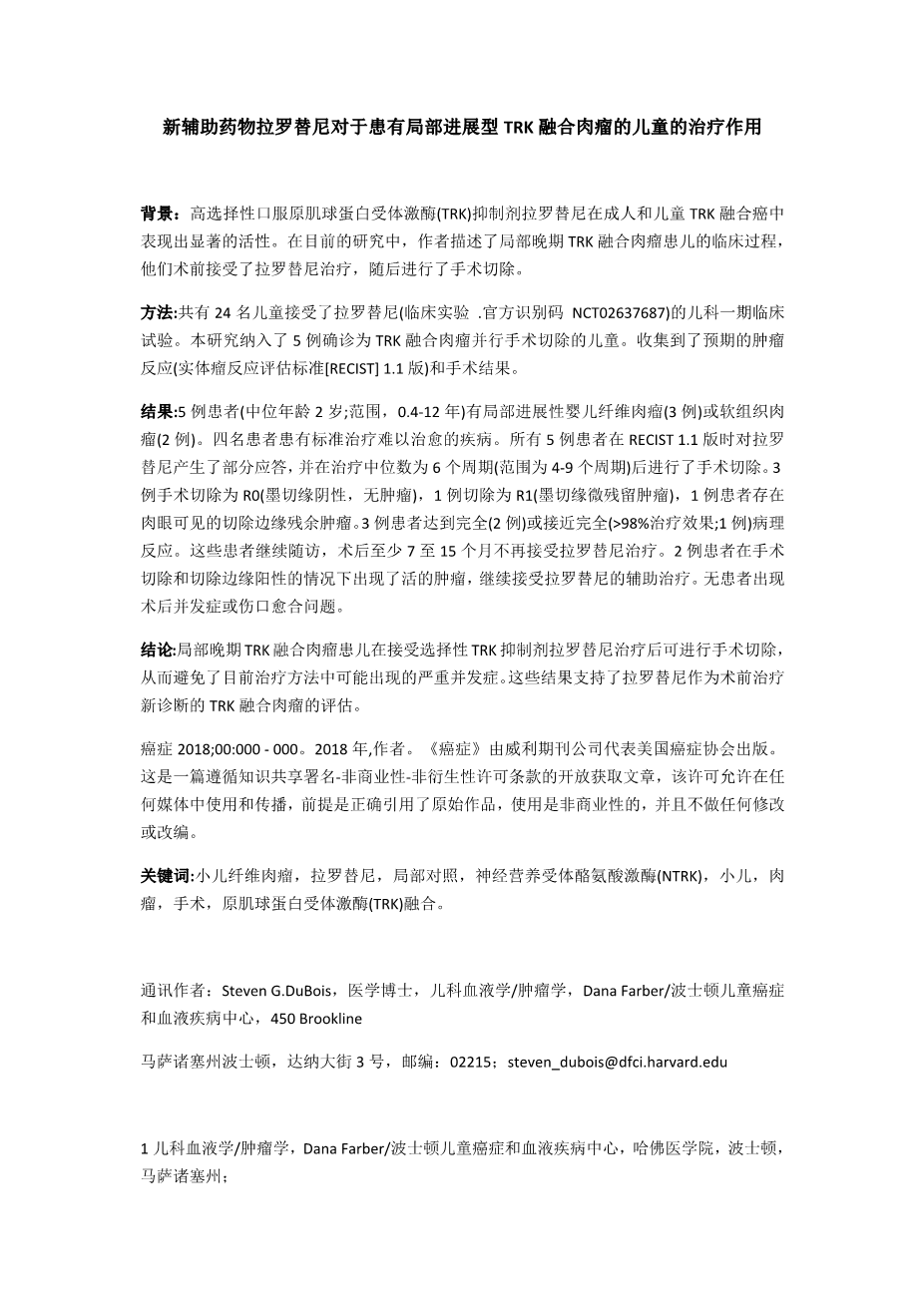 - 新辅助药物拉罗替尼对于患有局部进展型TRK融合肉瘤的儿童的治疗作用外文翻译资料
