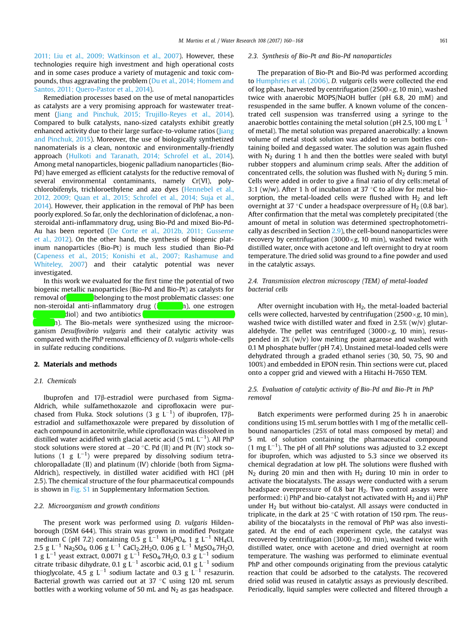 基于金属纳米颗粒作为催化剂的修复工艺是一种非常有前途的废水处理方法。与寻常催化剂相比,纳米催化剂的表面积体积比大。此外,使用生物合成的纳米材料是一种清洁,无毒且环保的方法。在金属纳米颗粒中,生物钯纳米颗粒作为还原性去除几种环境污染物(Cr(VI),聚氯联苯基,三氯乙烯和偶氮染料)的有效催化剂已经出现。但是,他们在去除药物中的应用一直没有得到很好的研究。迄今为止,仅报道了使用Bio-Pd和混合的Bio-PdAu对双氯芬酸(一种非甾体类抗炎药)进行脱氯的方法。另一方面,生物铂纳米粒子的合成研究要比Bio-Pd少得多,并且它们的催化潜力是从来没有调查过。在这项工作中,我们首次评估了两种生物金属纳米颗粒(Bio-Pd和Bio-Pt)作为催化剂去除四种最有问题类别的药物的潜力:一种非甾体类抗炎药(布洛芬) ,一种雌激素(17b-雌二醇)和两种抗生素(磺胺甲恶唑和环丙沙星)。使用微生物脱硫弧菌合成了生物金属,并在硫酸盐还原条件下将其催化活性与脱硫弧菌全细胞的药物去除效率进行了比较。