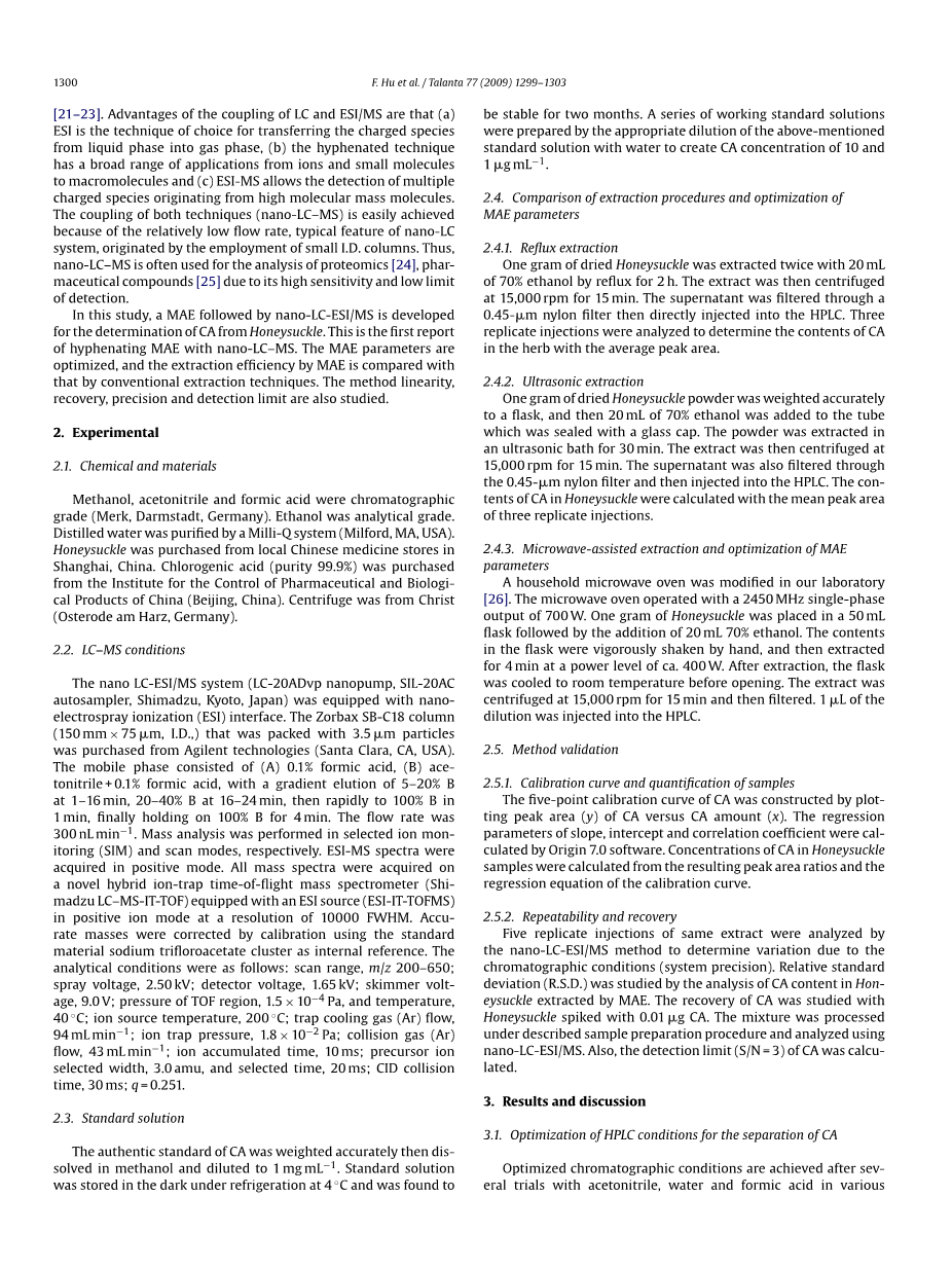 微波加热涉及基于微波辐射引起的传导和介电极化的内部加热[8]。近年来,微波辅助提取(MAE)作为传统固液萃取方法的潜在替代品已经获得越来越多的关注,主要是由于大大节省了处理时间和溶剂消耗[9,10]。与传统的加热-回流提取法相比,微波辐射可以加速细胞破裂,使植物样本细胞的内部温度升高和内部压力增加,这促进了样品表面保护膜的破坏[11],使提取变得更有效。 这项技术已被用于从不同植物基质中提取各种生物活性化合物[12-17]。 在我们以前的研究[18]中,微波辅助提取随后进行气相色谱 - 质谱(GC-MS)这项技术已经应用于中草药分析。最近,高效液相色谱(HPLC)的发展取得显着进步,已经应用于分离和分析中草药中的组分。 纳米液相色谱是一种新的强有力的分析工具,它的分析将在小内径(I.D.lt;300 m)的毛细管中进行,该毛细管含有通常在高效液相色谱法中使用的固定相,与常规分析方法相比,纳米液相色谱提供了几个优点,例如,在短时间内实现成分的高效率快速分离,使用小体积的流动相以及少量的包装材料[19,20]和低样品稀释比。 然而,由于注射的样品体积小和在UV检测中使用的检测单元的路径长度短,所述方法未能证明其灵敏度符合标准。 纳米液相色谱与质谱的结合是增强方法灵敏度的有效途径。电喷雾离子化现在已成为液相分离技术在线耦合的最重要的电离技术,例如液相色谱与质谱[21-23]。液相色谱和电喷雾离子化-质谱耦合的优点是:(a)电喷雾离子化是用于将带电物质从液相转移到气相中的技术上的一种选择,(b)连接技术具有从离子或小分子到大分子的广泛应用(c)电喷雾离子化-质谱允许检测源自高分子量分子的多种带电物种。因为其具有相对低的流速,液相色谱的典型纳米特征,同样起源于使用小I.D.列,使两种技术(纳米液相色谱-质谱)的耦合容易实现,因此,由于其具有高灵敏度和低检测限度,纳米液相色谱-质谱通常用于蛋白质组学[24],药物化合物[25]的分析。在本研究中,采用纳米液相色谱-电喷雾离子化/质谱用于测定金银花的绿原酸。这是第一个关于用纳米液相色谱-质谱连接微波辅助提取的报告。本论文优化了微波辅助提取的参数,将微波辅助提取的提取效率与常规提取技术的提取效率进行比较。还研究了方法的线性,回收率,精确度和检测限度。