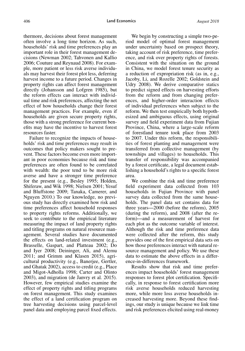 忽略农户风险和时间偏好对决策的影响可能会导致政策制定者停止实施某项政策。在贫困国家,由于风险和时间偏好与财富相关,其显得更为重要:贫穷的人往往倾向于规避风险并看重眼前利益(Besley, 1995; Holden et al., 1998; Nielsen, 2001; Yesuf Nguyen, 2010)。就我们所知,目前尚未有研究探究风险和时间偏好如何影响农户对产权改革的态度。另外,我们丰富了产权对自然资源影响的实证文献。已有文献探究了对土地投资、农业生产率、信贷的可获得性、移民的影响。然而,少有研究讨论产权政策对森林管理的影响。本研究使用parcel-level面板数据和parcel固定效应模型检验了产权证实施对林木采伐决策的影响。