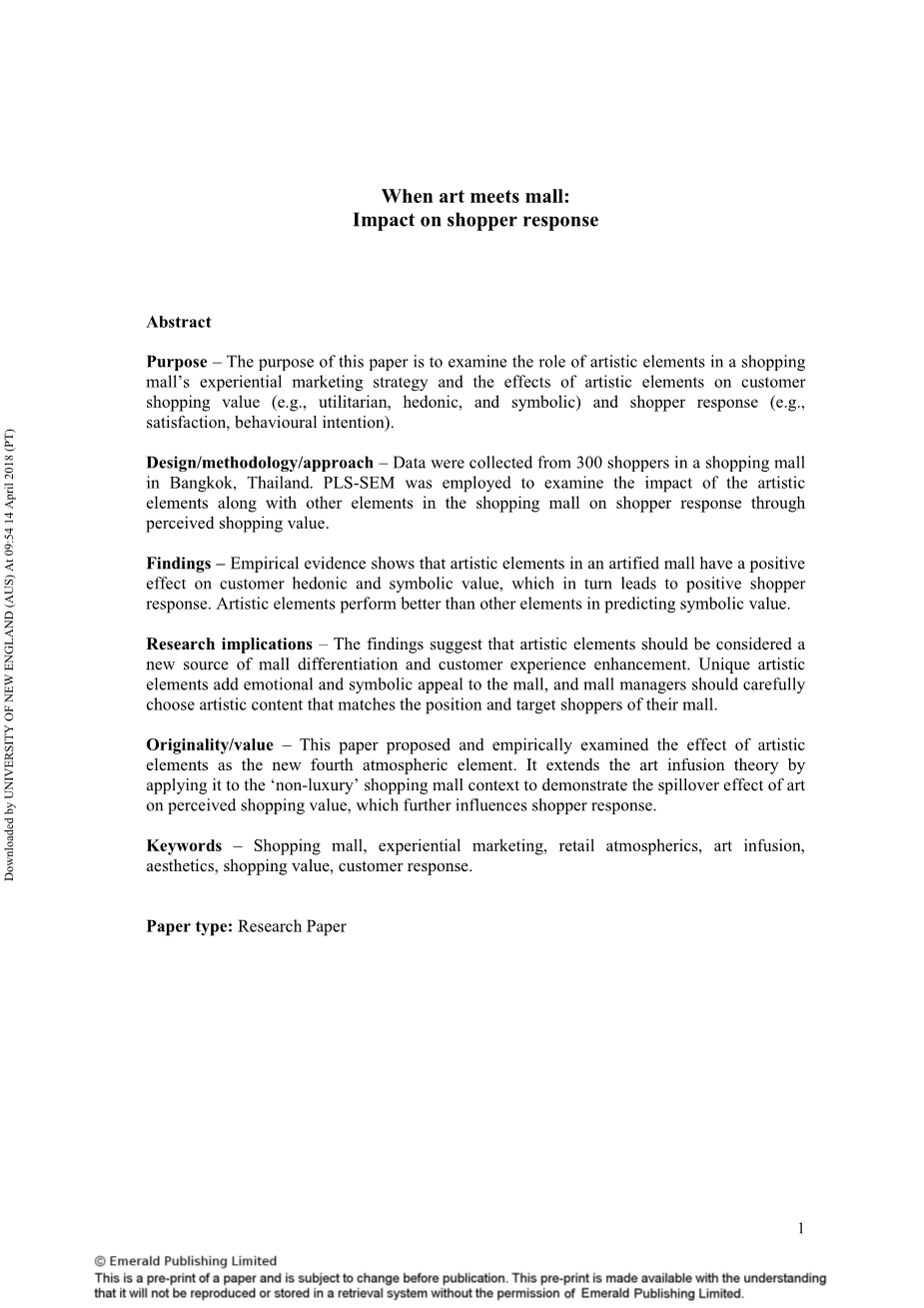 摘要:本文的目的是研究艺术因素在购物中心的体验式营销策略中的作用以及艺术因素对顾客购物价值(例如,功利价值、享乐价值和象征价值)和购物者反应(例如:满意度,行为意图)的影响。研究数据收集于泰国曼谷的一家购物中心的300名购物者。研究使用PLS-SEM通过感知的购物价值来检验艺术因素以及购物中心中其他因素对购物者反应的影响。证据表明,艺术购物中心中的艺术因素对顾客享乐和象征价值产生积极影响,进而导致积极的购物者反应。艺术因素在预测象征价值方面优于其他因素。研究结果表明,艺术因素是购物中心差异化和增强顾客体验的新来源。独特的艺术因素为购物中心增添了情感和象征吸引力,购物中心应谨慎选择与购物中心的定位和目标购物者相匹配的艺术内容。本文提出并通过经验检验了艺术因素作为新的第四种氛围因素的效果。它通过将艺术介入理论应用于“非豪华”购物中心来扩展艺术介入理论,以证明艺术对感知购物价值的溢出效应,从而进一步影响购物者的反应。
