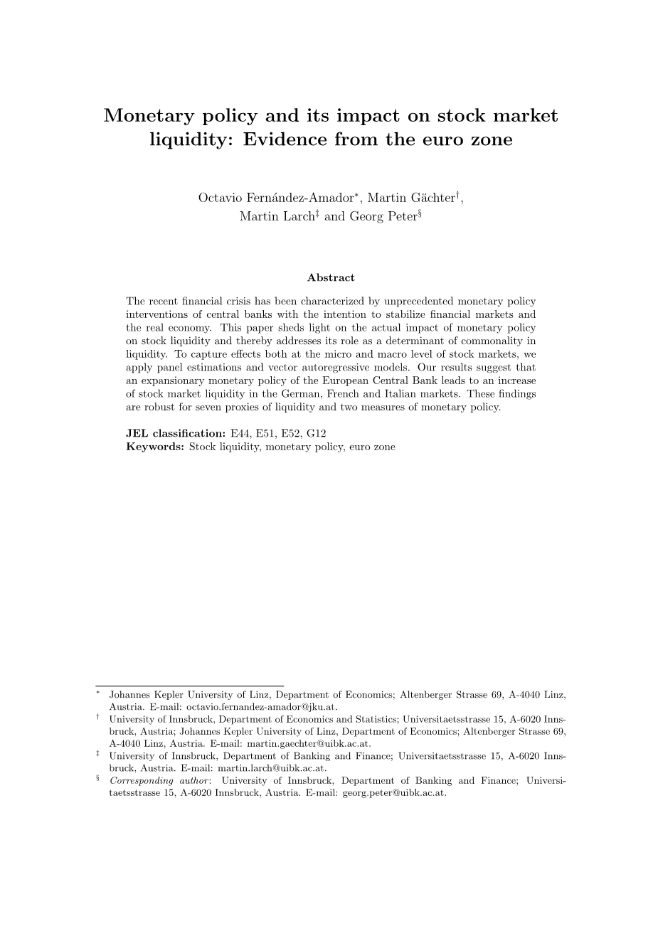 金融市场的流动性被定义为“交易的便利性”(Amihud和其他人在2005年提出),因为最近的金融危机突显了它作为运转良好和高效市场的先决条件,因此引起了很多关注。 尽管通过大规模的货币政策干预,全球各国央行都试图通过大规模货币政策干预来放松金融市场,但我们目前对于货币政策对股票流动性的实际关系知之甚少。