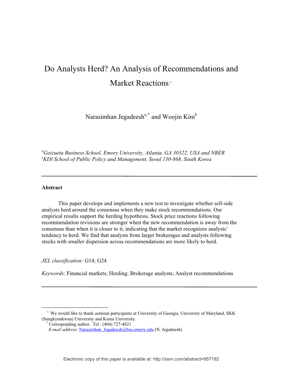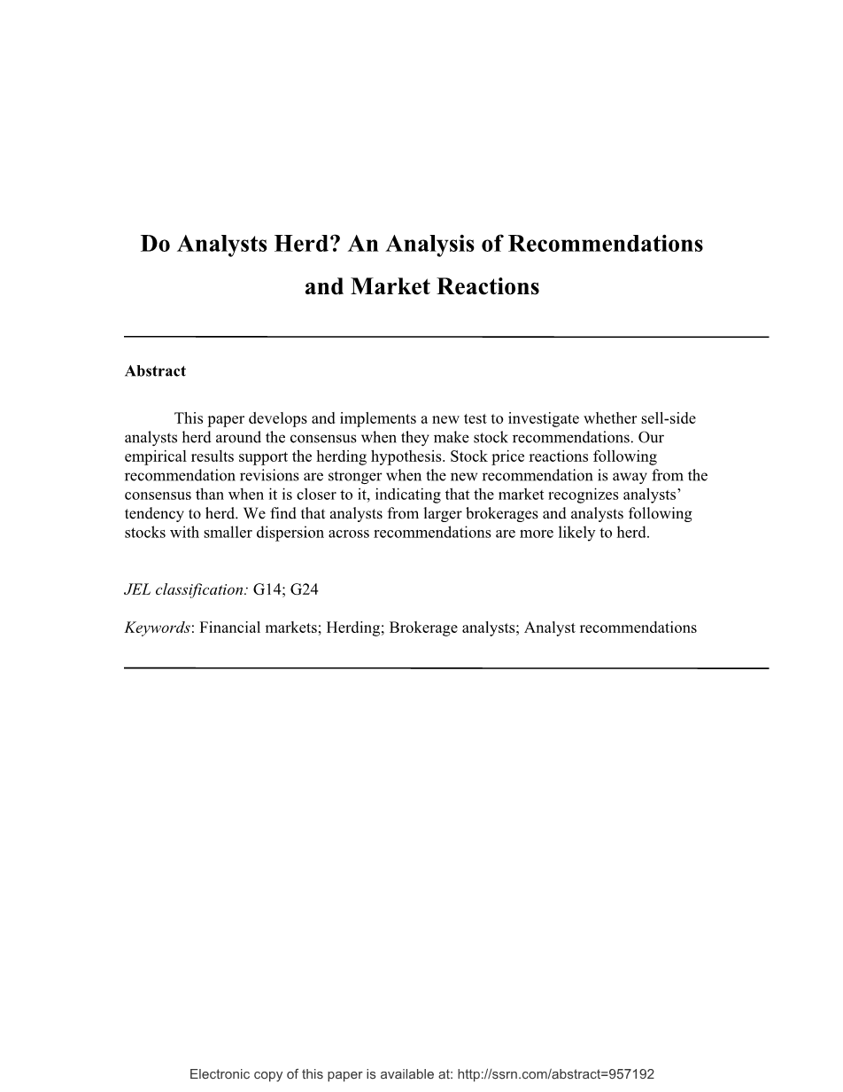 摘要:本文开发并实施了一项新的测试,以调查卖方分析师在提出股票建议时是否围绕这一共识开展工作。我们的实证结果支持放羊假说。推荐修订后的股票价格反应在新的建议远离共识时比接近时更为强烈,这表明市场认可分析师的羊群行为倾向。我们发现来自大型券商的分析师和跟随建议中分散较小的股票的分析师更有可能有羊群行为。