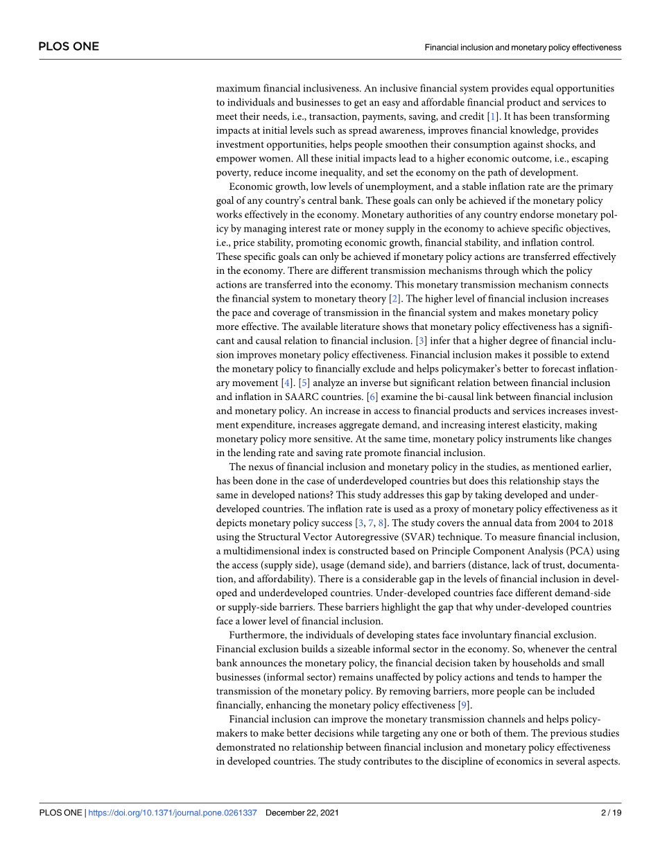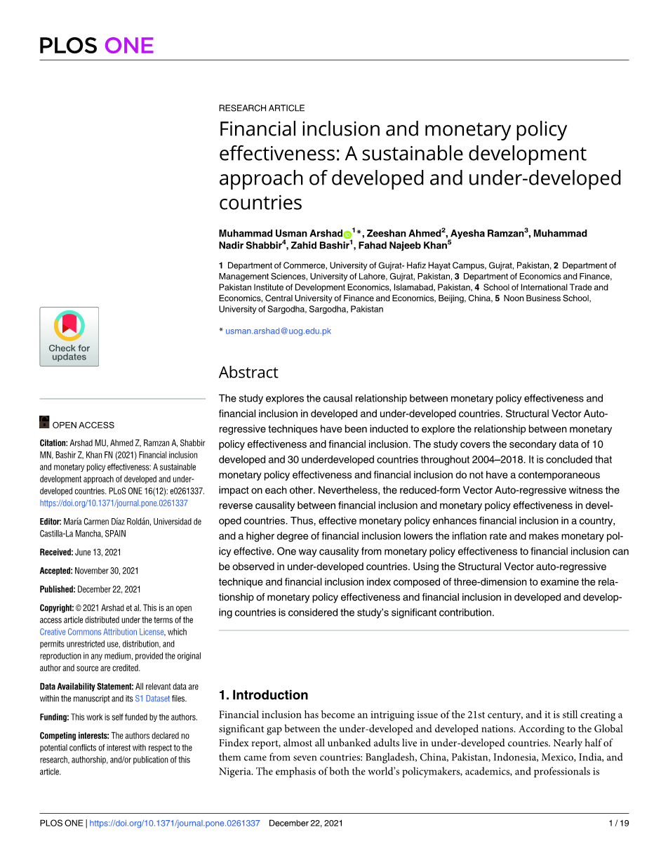 外文文献出处:Arshad MU, Ahmed Z, Ramzan A, Shabbir MN, Bashir Z, Khan FN. Financial inclusion and monetary policy effectiveness: A sustainable development approach of developed and under-developed countries. PLoS ONE. 2021;16(12):1-19.