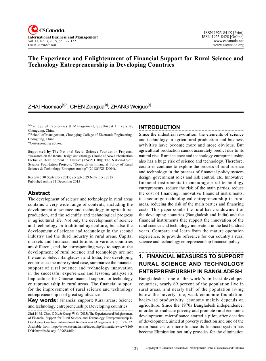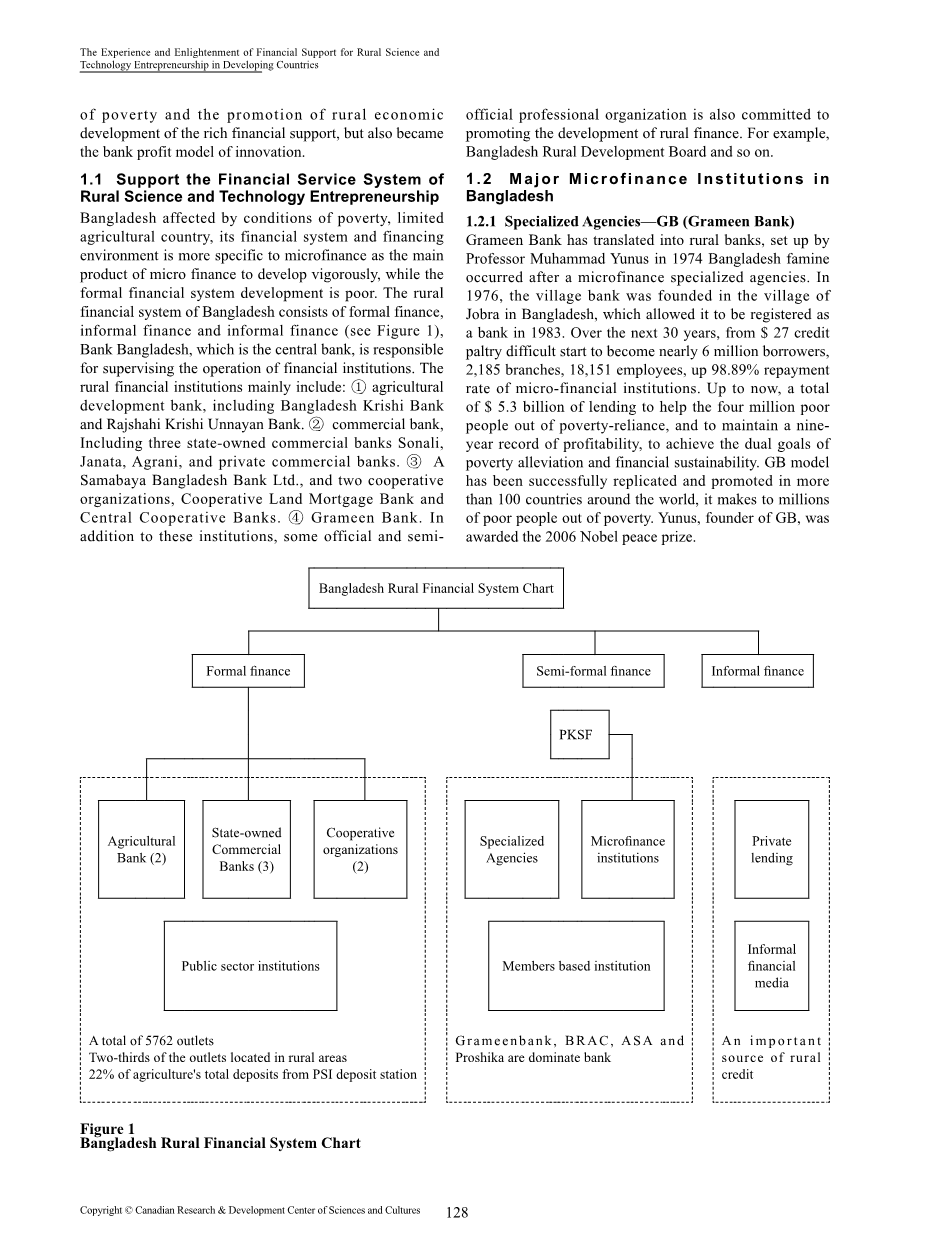 摘要:农村地区的科技发展包含的内容非常广泛,包括农业生产中的科技发展,农村科技发展的内容非常广泛,包括农业生产中的科技发展,以及农业生活中的科技进步.农村生活中的科技进步不仅是传统农业的科技发展也包括第二代农业科技的发展、农村第二产业和第三产业的科技发展。各国的资本市场和金融机构不同,支持农村科技发展的相应方式也不尽相同。农村科技发展的相应方式也不的方式也不尽相同。选择孟加拉国和印度这两个发展中国家 发展中国家作为比较典型的案例,总结一下金融对农村科技创新的支持中的成功经验和教训,分析其对中国金融支持科技发展的启示农村地区的创业精神。财政支持对提高农村科技创业具有重要意义。