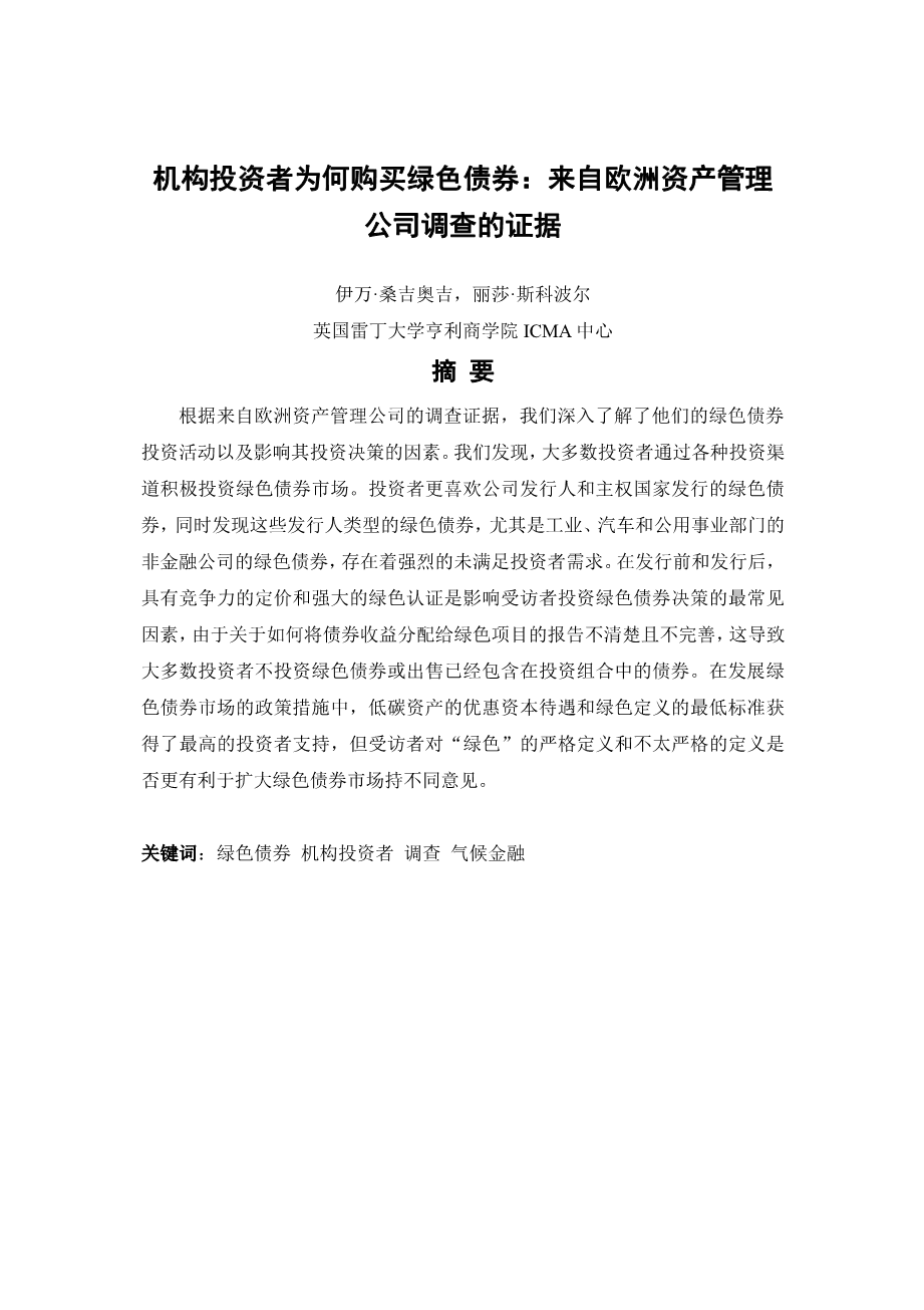 机构投资者为何购买绿色债券:来自欧洲资产管理公司调查的证据外文翻译资料 2023-04-14 17:19:32 英语原文共 21 页,剩余内容已隐藏,支付完成后下载完整资料 英语译文共 49 页,剩余内容已隐藏,支付完成后下载完整资料 资料编号:[589437],资料为PDF文档或Word文档,PDF文档可免费转换为Word 您需要先支付 30元 才能查看全部内容!立即支付 发小红书推广免费获取该资料资格。点击链接进入获取推广文案即可: Ai一键组稿 | 降AI率 | 降重复率 | 论文一键排版 PREVIOUS NEXT 您可能感兴趣的文章 环境责任保险的协同机制与风险管理研究文献综述 贸易战背景下的汇率变动及汇率政策研究文献综述 基于ARMA-GARCH模型的投资者情绪与中国股票市场平均市盈率互动关系研究文献综述 金融发展对居民消费的影响文献综述 我国农村商业银行信贷风险影响因素分析——以江苏省为例文献综述 互联网金融对商业银行盈利能力的影响分析文献综述 中国外汇储备变动对货币供给的影响研究文献综述 中国国债期货期现套利研究文献综述 商业银行贷款业务风险测度与防范研究文献综述 p2p网贷借款利率影响因素的实证研究开题报告