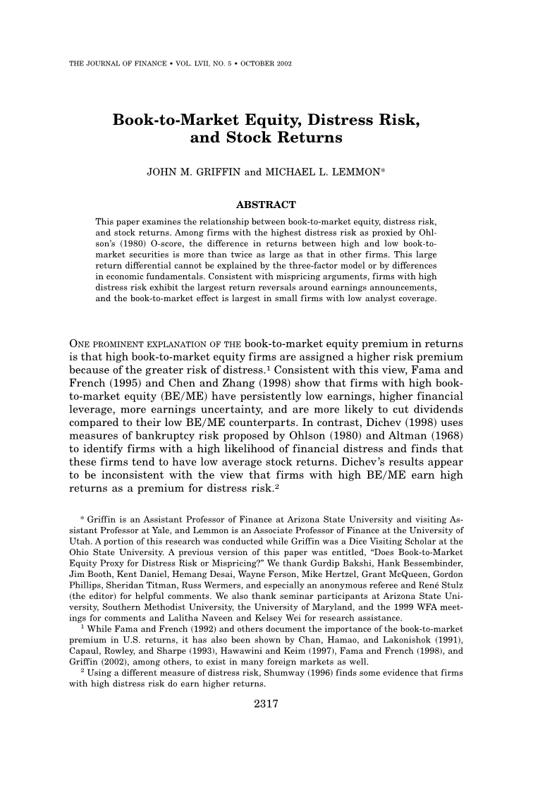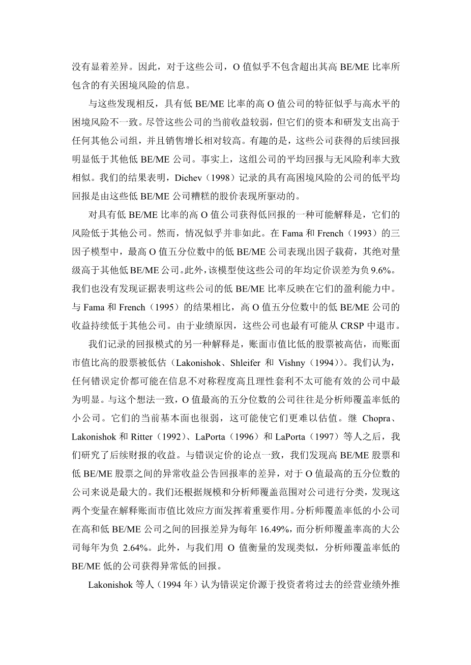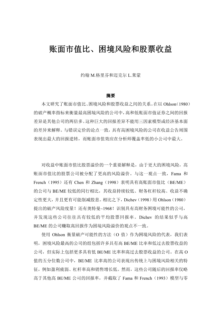 账面市值比、困境风险和股票收益外文翻译资料 2023-04-14 17:20:27 英语原文共 20 页,剩余内容已隐藏,支付完成后下载完整资料 英语译文共 17 页,剩余内容已隐藏,支付完成后下载完整资料 资料编号:[589433],资料为PDF文档或Word文档,PDF文档可免费转换为Word 您需要先支付 30元 才能查看全部内容!立即支付 发小红书推广免费获取该资料资格。点击链接进入获取推广文案即可: Ai一键组稿 | 降AI率 | 降重复率 | 论文一键排版 PREVIOUS NEXT 您可能感兴趣的文章 环境责任保险的协同机制与风险管理研究文献综述 贸易战背景下的汇率变动及汇率政策研究文献综述 基于ARMA-GARCH模型的投资者情绪与中国股票市场平均市盈率互动关系研究文献综述 金融发展对居民消费的影响文献综述 我国农村商业银行信贷风险影响因素分析——以江苏省为例文献综述 互联网金融对商业银行盈利能力的影响分析文献综述 中国外汇储备变动对货币供给的影响研究文献综述 中国国债期货期现套利研究文献综述 商业银行贷款业务风险测度与防范研究文献综述 p2p网贷借款利率影响因素的实证研究开题报告