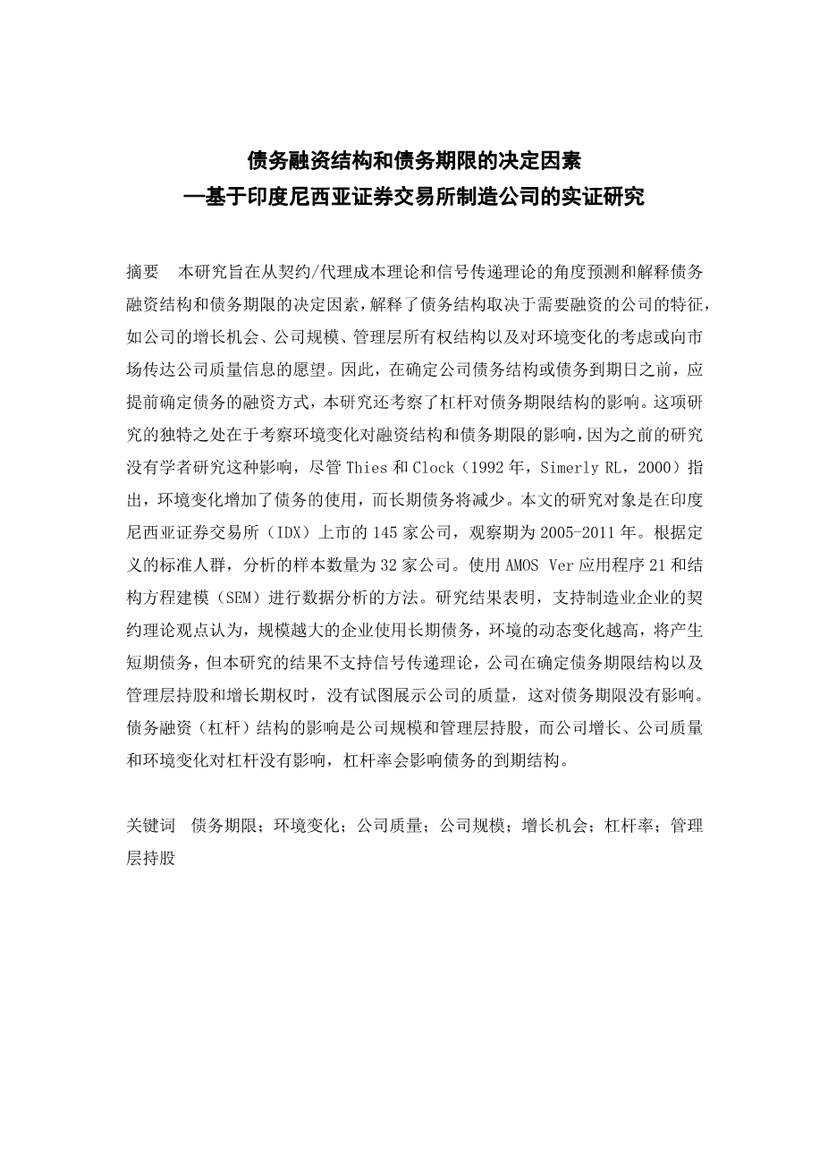 Abstract This study aims to predict and explain the determinants of debt financing structure and debt maturity from the perspective of contracting /agency cost theory and Signaling theory that explains that determines the structure of debt depends on the characteristics of companies that need funding as the companys growth opportunities, firm size , managerial ownership structure as well as the consideration of a change in environment or a desire to signal to the market about the quality of the company. Therefore, before determining the structure of corporate debt or debt maturity should be decided in advances that the financing of the debt taken, the study also examines the effect of leverage on the term structure of debt. The uniqueness of this study was to examine the effect of environmental change on the structure of funding and debt maturity, because previous research no one has studied the effect, although Thies and Clock (1992 in Simerly RL 2000) states that environmental changes increased the use of debt and long-term debt will decrease. The population of the research is the entire manufacturing companies listed in Indonesia Stock Exchange (IDX) of 145 companies with the observation period 2005-2011. Based on the criteria defined population, the number of samples analyzed was 32 companies. Methods of data analysis using Structural Equation Modeling (SEM) using AMOS Ver application program 21. The study findings suggest that contracting theoretical perspective that supports manufacturing companies that the larger companies use long-term debt, and the higher the dynamic changes in the environment will take a short-term debt, but the results of this study do not support the signaling theory, that the company is not trying to show the quality of the company in determining the maturity structure of the debt as well as managerial stock ownership and growth options has no effect on debt maturity. While the effect on the structure of the debt financing (leverage) is the size of the company and managerial stock ownership, while, corporate growth, corporate quality, and environmental changes found to have no effect on leverage. Leverage found to affect the maturity structure of the debt.