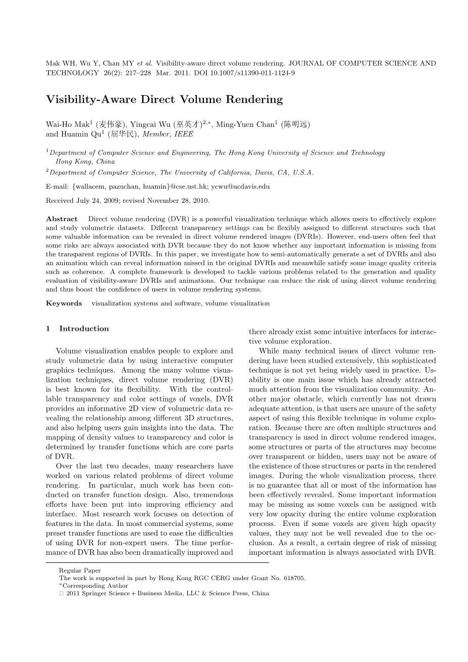摘要 直接体绘制(DVR)是一款功能强大的可视化技术,它允许用户有效地探索学习立体数据集。不同透明度设置可以灵活分配到不同的结构,使得一些有价值的信息可以直接用体绘制图像(DVRIs)透露。然而,最终用户经常感觉有一些与DVR相关联的风险,因为他们不知道是否有什么重要的信息来自失踪的DVRIs的透明区域。在本文中,我们研究如何半自动生成一组DVRIs,这使动画在原来DVRIs的基础上错过了可披露信息,同时也为了满足一些图像质量标准如连贯性。一个完整的框架得以确立,来解决相关质量的问题和可见感知DVRIs的动画的评估。我们的技术可以减少使用直接体绘制的风险从而拉动用户的对体绘制系统的信任。