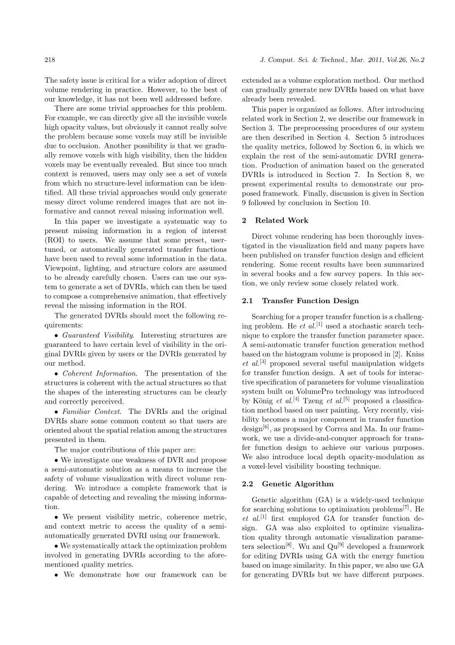 搜索一个适当的传递函数是一个具有挑战性的问题。他们等人[1]使用随机搜索技术,探索传递函数的参数空间。基于直方图体积的半自动传递函数生成方法在[2]提出。尼斯等人[3]提出了一些有用的操作部件转移功能设计。一种建立在VolumePro技术体系上用于卷可视化的参数规格互动的工具并通过考尼格[4]曾化仪等人[5]提出了基于用户绘画一种分类方法。最近,科雷亚和麦伟豪建议能见度成为在传递函数的主要成分设计[6]。在我们的框架中,我们采用了分而治之的办法转移功能设计来实现我们的各种用途。我们还为一个像素级的可视性增强技术引入局部深度不透明度。