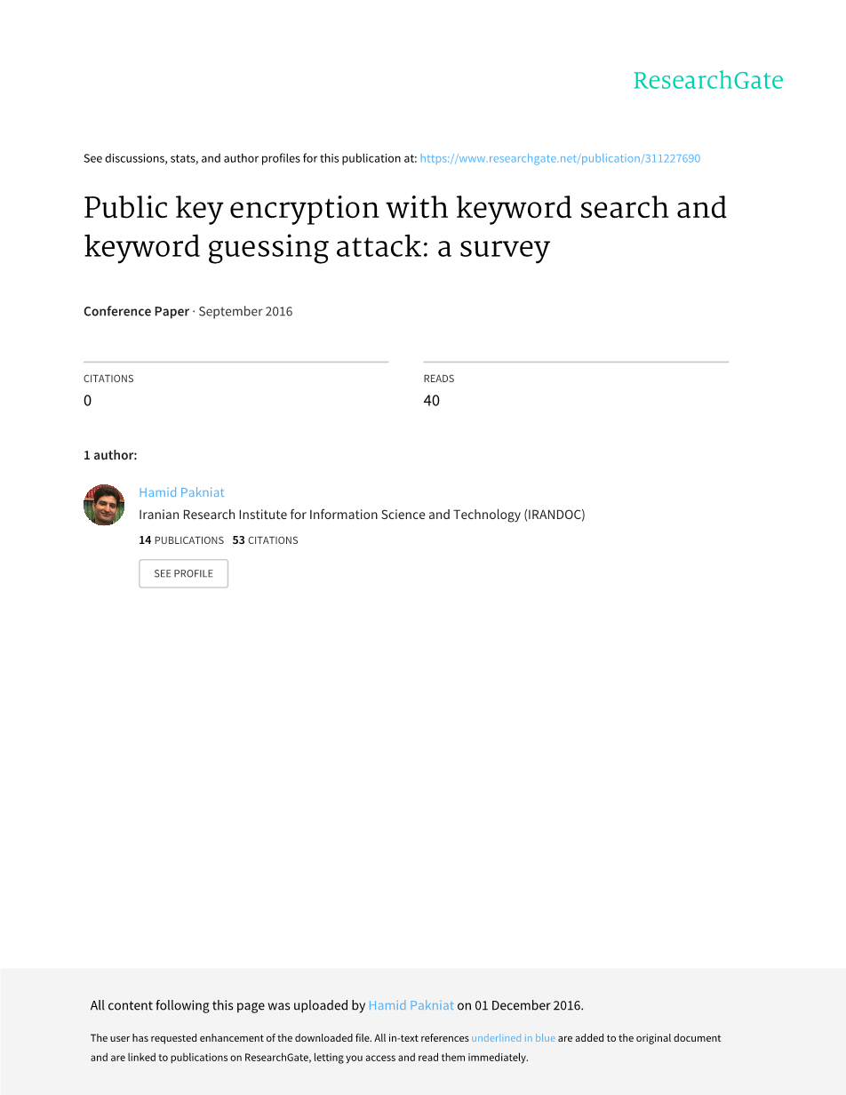 摘要:可搜索加密是一种加密概念,它使用户能够进行对存储在不受信任的服务器上的数据加密的安全搜索。可搜索加密技术的方法可分为两大类:搜索对称加密(SSE)和公钥加密关键词搜索(PEKS)。不同于上述技术的是,PEKS方法容易受到关键字猜测攻击,其中攻击者首先生成对应所有可能的加密标签关键词。然后,通过访问一个陷门,一次匹配可以找到并搜索关键字和包含它的文件。攻击的可行确定是因为选择关键字的空间范围很小。在本文中,回顾了可搜索加密概念,关键字猜测攻击的描述和讨论了PEKS方案对这种攻击的脆弱性。接着,本文提供了一种方法企图克服这个缺点。最后提出了这一领域的问题和未来研究方向。
